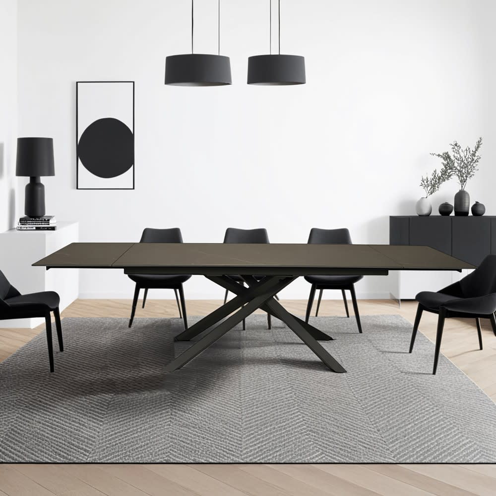 Ausziehbarer Esstisch. Verlängerung um 100cm (2 Verlängerungen à 50cm). Gesamtlänge 281cm. Geschlossene Länge 181cm. Breite 91cm. Gesamthöhe 75.7cm. Höhe der Beine 66cm. Tischplatte aus gesintertem Stein. Füße aus Metall. Zum Selbstaufbauen