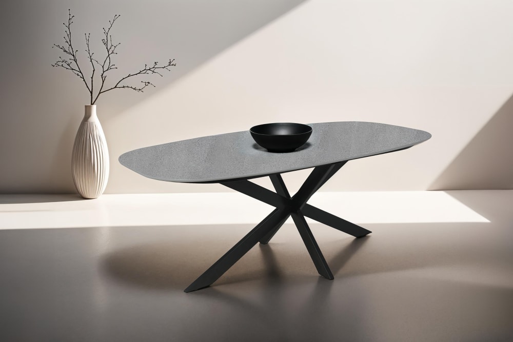 Der OVAL Tisch in edler Stein-Optik kombiniert eine robuste MDF-Tischplatte mit einem stabilen schwarzen Stahlgestell.