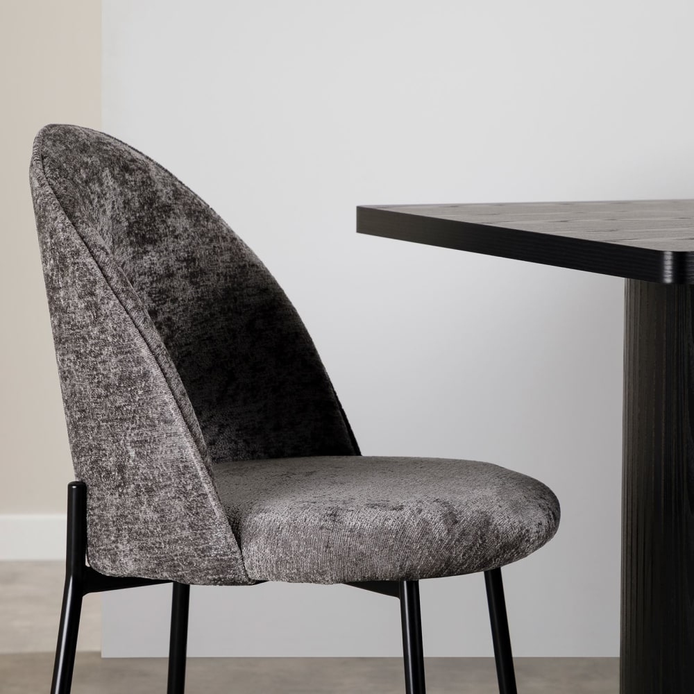 Dieses stilvolle Esszimmermöbel Set überzeugt mit einem modernen Design und hochwertigen Materialien. Der rechteckige Esstisch in schwarzer Holzoptik bietet dank seiner geriffelten Beine und abgerundeten Ecken einen besonderen Blickfang. Die 4 gepolsterten Stühle mit grauem Stoffbezug und schwarzem Metallgestell sorgen für Komfort. Die pflegeleichten Oberflächen machen das Set ideal für Ihr Esszimmer oder Ihre Küche.