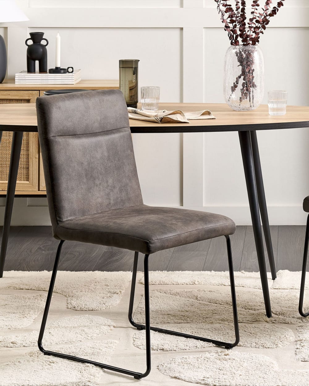 Die angenehm gepolsterten Sitzschalen verfügen über einen strapazierfähigen Bezug in edlem Dunkelgrau mit einer horizontalen Ziernaht. Schlanke Gestelle in Kufenform aus schwarzem, pulverbeschichtetem Metall sorgen für Stabilität und unterstreichen die elegante Ausstrahlung. Dieses exklusive Modell lässt sich vielseitig als Esszimmerstuhl, Arbeits- oder Schreibtischstuhl, sowie auch in Büro- und Konferenzräumen nutzen, und kann wunderbar mit modernen, klassischen und eleganten Einrichtungsstilen kombiniert werden.