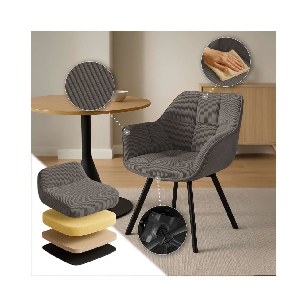 Der Stuhl lässt sich einfach montiert im Versandzustand erhalten. Dank seiner nicht verstellbaren Armlehnen und modernen Cordbezug fügt er sich harmonisch in verschiedenste Wohnstile ein, von modern bis klassisch.