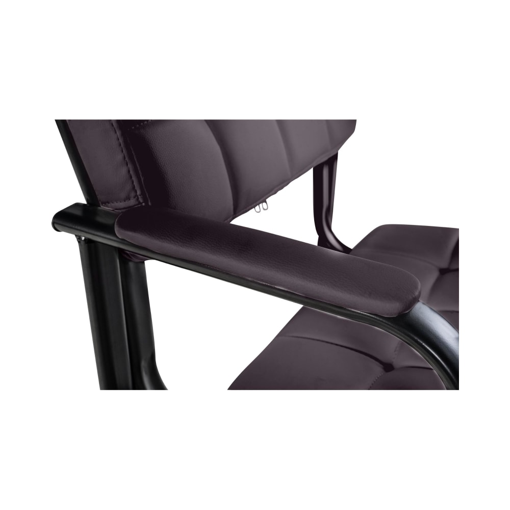 Das gesteppte Kunstleder verleiht ihm eine moderne Note, während das geschwungene Stuhlgestell aus schwarz lackiertem Metall Stabilität und Eleganz vereint. Vielseitig einsetzbar, passt der Stuhl in verschiedenste Umgebungen und lässt sich leicht in bestehende Einrichtungen integrieren. Die pflegeleichte Oberfläche des Kunstleder-Bezugs erleichtert die Reinigung, während Bodenschoner das Möbelstück und den Boden schützen.