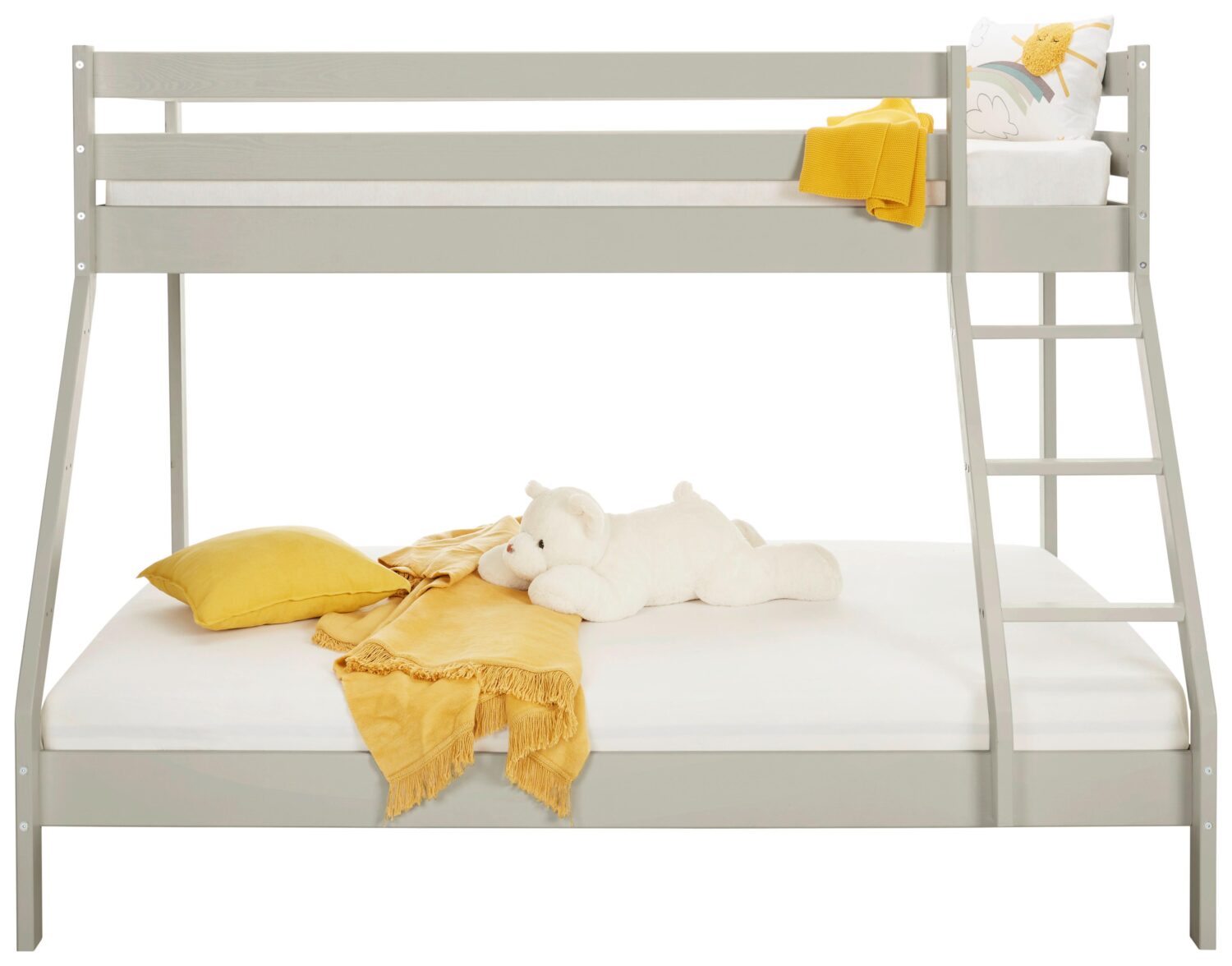 Suchen Sie nach einer platzsparenden und stilvollen Schlaflösung für Ihr Zuhause? Unser graues Etagenbett aus hochwertigem Holz bietet die perfekte Kombination aus Funktionalität und Design. Unser Etagenbett ist die ideale Wahl für Familien, die mehr Platz im Kinderzimmer schaffen möchten, oder für Gästezimmer, die flexibel genutzt werden sollen. Mit einer maximalen Belastbarkeit von ca. 90 kg je Schlafstelle bietet es sicheren und komfortablen Schlaf für Kinder und Erwachsene gleichermaßen. Das schlichte, moderne Design in Grau passt zu nahezu jeder Einrichtung und verleiht Ihrem Raum eine zeitlose Eleganz. Die optional erhältliche Bettlade bietet zusätzlichen Stauraum für Bettwäsche, Spielzeug oder andere Utensilien, und hilft dabei, das Zimmer ordentlich und aufgeräumt zu halten. Dieses Etagenbett ist nicht nur funktional, sondern auch ein echter Hingucker in Ihrem Zuhause. Investieren Sie in Qualität und Stil – mit unserem Etagenbett in Grau aus Holz.