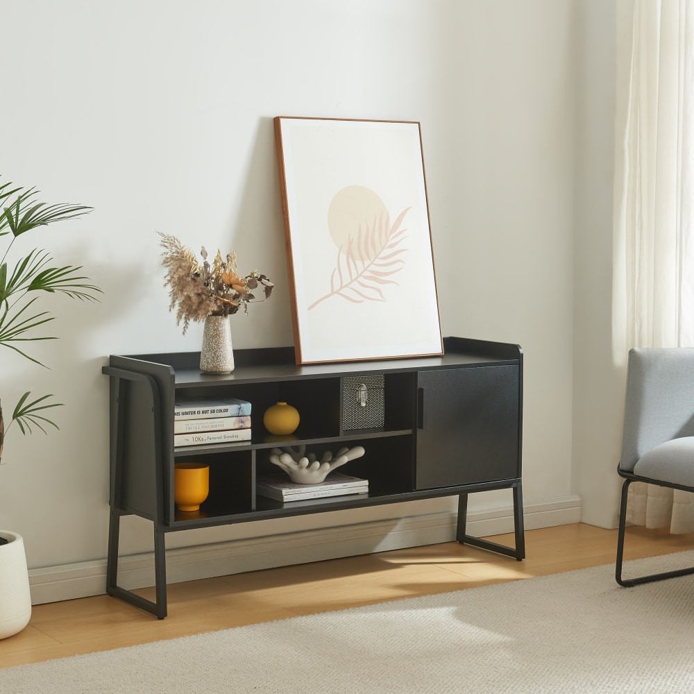 Die großzügige Tischplatte des Fernsehtisches bietet ausreichend Platz für Ihren Fernseher. Darunter befinden sich insgesamt vier offene Ablagefächer, die ideal sind für die Aufbewahrung von Mediengeräten wie DVD-Playern oder Spielekonsolen. Dies trägt nicht nur zu einem aufgeräumten Erscheinungsbild bei, sondern sorgt auch dafür, dass alle wichtigen Geräte und Zubehörteile stets zur Hand sind.