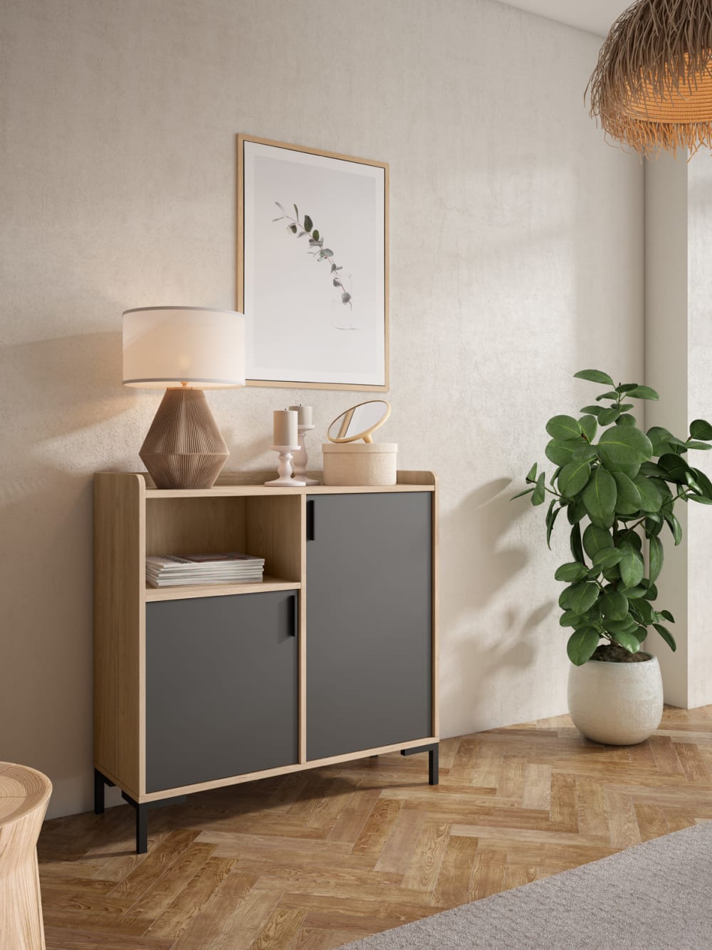 Verleihe deinem Zuhause Stil und Funktionalität mit diesem eleganten Sideboard aus Melamin, perfekt für eine organisierte Aufbewahrung. Das geschwungene und moderne Design mit schwarzen Metallfüßen und Griffen macht es zu einer robusten und anspruchsvollen Wahl. Ideal als Schuhschrank oder zur Aufbewahrung anderer Gegenstände, macht seine Vielseitigkeit es unverzichtbar im Eingangsbereich, Wohnzimmer oder Schlafzimmer. Optimiere deinen Raum mit diesem praktischen und dekorativen Möbelstück, das Qualität, Design und Nutzen in einem Produkt vereint. Mach dein Zuhause ordentlicher und stilvoller!Eigenschaften :Materialien : Struktur und Türen aus Melamin, Füße und Griffe aus Metall mit Ofenlackierung zum Schutz vor Oxidation.Zurückgesetzte Türen für eine geometrischere Optik.2 asymmetrische Türen.1 herausnehmbares Fach in der unteren Tür und 2 herausnehmbare Fächer in der oberen Tür.Fächer in fester horizontaler Position.Soft-Close-Scharniere zur Vermeidung von Türknallen.Zertifikate : FSC, PEFC.Herstellung : Spanien.Rückwand zum Schutz der Wand vor Flecken.Möbel als Bausatz mit Montageanleitung.Versand in 1 Paket.Pflegehinweis :Reinigung mit trockenem oder leicht feuchtem Tuch unter Verwendung ausschließlich geeigneter Produkte für Holz und Möbel (das Möbelstück zu nass machen oder mit einem tropfnassen Tuch reinigen kann es beschädigen und ist nicht durch die Garantie gedeckt).Gesamtmaße :Höhe : 88 cm.Breite : 90 cm.Tiefe : 33 cm.Gewicht : 29,5 kg.Spezifische Maße :Offenes Fach: H21,7 x B42,5 x T32 cm.Fußhöhe: 12 cm.Nutzbare Fläche der Oberplatte: Länge 86,5 cm, Tiefe 31 cm.Höhe oberer Rand: 4 cm.