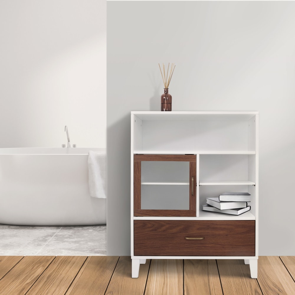 Der freistehende Badezimmerschrank Tyler im zweifarbigen Design verfügt über eine Kombination aus Weiß und Holzoptik, die zu jedem Badezimmerstil passt. Das kontrastreiche Design verleiht diesem Möbelstück einen ganz neuen Look.