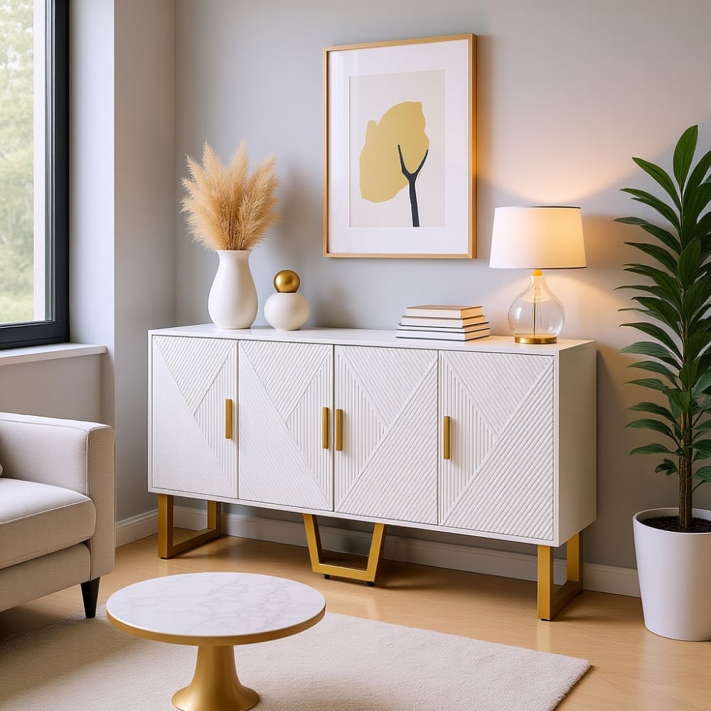Mit seinem robusten, hochwertigen Holzrahmen ist dieses Sideboard außergewöhnlich langlebig und hält dem täglichen Gebrauch stand. Die glatte weiße Oberfläche reflektiert das Licht und vergrößert optisch den Raum, während die goldenen Details einen Hauch von Glamour verleihen, der perfekt zu modernen, skandinavischen oder minimalistischen Einrichtungen passt. Sein raffinierter Look macht es nicht nur zu einem funktionalen Aufbewahrungsmöbel, sondern auch zu einem dekorativen Element.