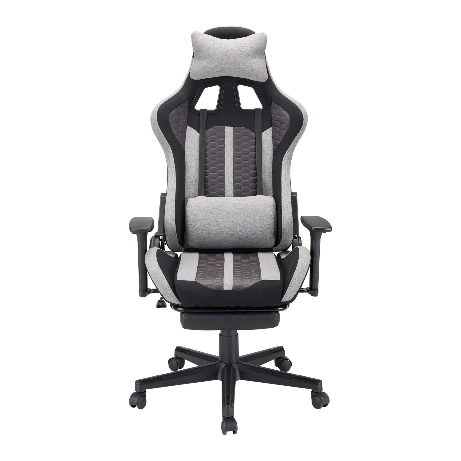 Dieser stilvolle Gamingstuhl in elegantem Grau bietet optimalen Komfort für lange Gaming-Sessions. Mit den Maßen von ca. 63 x 114 x 62 cm ( B x H x T ) ist der Stuhl speziell für Nutzer mit einer maximalen Größe von 180 cm ausgelegt. Der Stuhl besteht aus robustem Metall und Kunststoff, wobei die Textiloberfläche aus strapazierfähigem Polyester gefertigt ist. Die mattierte Metalloberfläche und das formstabile Nylon gewährleisten Langlebigkeit und Stabilität, während die bequeme Flachgewebe-Polsterung höchsten Sitzkomfort bietet. Der Gamingstuhl ist für eine tägliche Nutzungsdauer von bis zu 8 Stunden konzipiert und verfügt über eine verstellbare Rückenlehne mit Relaxfunktion, höhenverstellbare Armlehnen und ein bequemes Drehkreuz mit fünf Hartbodenrollen für maximale Flexibilität. Das Nacken- und Lendenkissen sowie die Rautensteppung sorgen für zusätzlichen Komfort. Dank der einfachen Montage und der pflegeleichten Materialien ist dieser Gamingstuhl der perfekte Begleiter für anspruchsvolle Gamer.