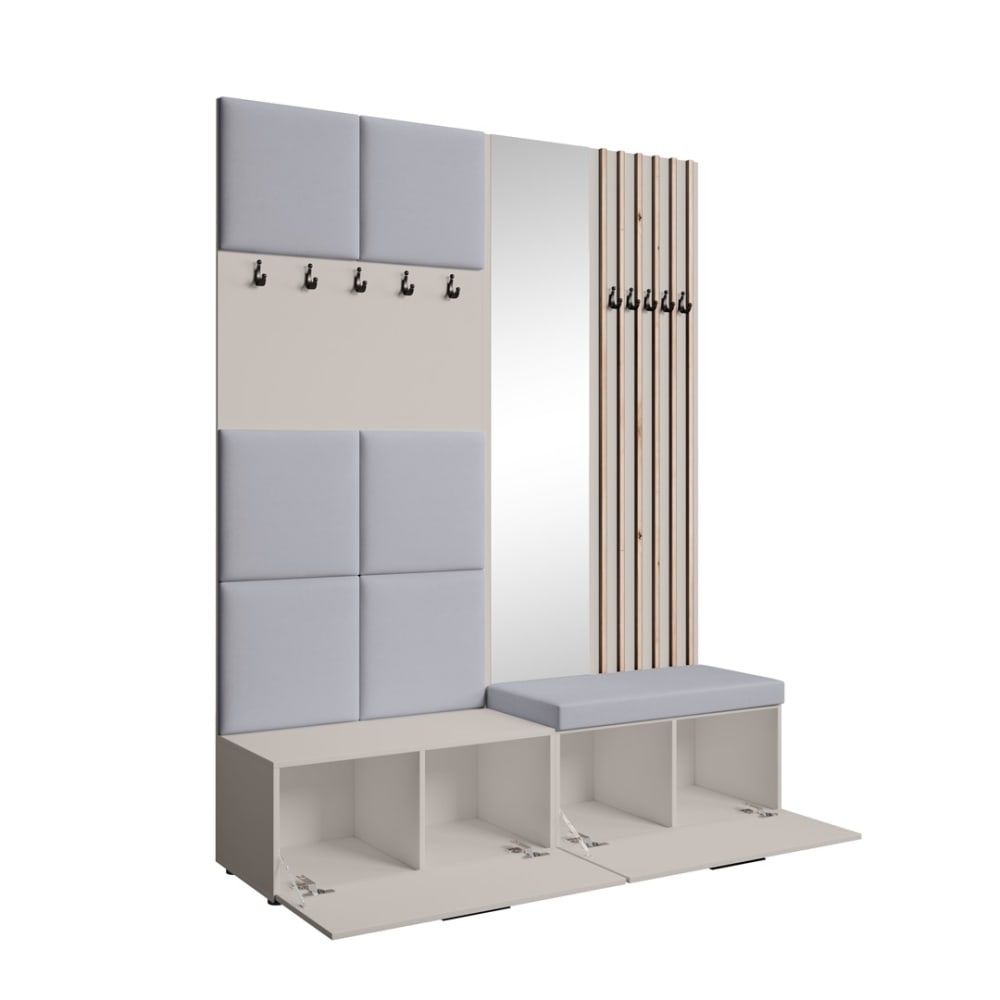 Die gepolsterten Paneele sorgen für bequemen Sitz beim Anziehen der Schuhe und verleihen deinem Flur einen luxuriösen Look. Der große Spiegel ermöglicht es, dein Outfit schnell zu überprüfen und lässt den Raum optisch größer erscheinen. Die dekorativen Lamellen setzen moderne Akzente und passen sich perfekt in das Gesamtdesign ein.