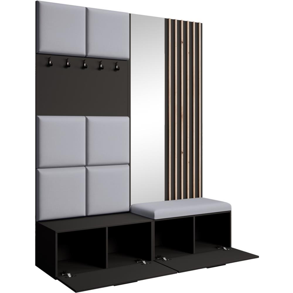 Die gepolsterten Paneele sorgen für bequemen Sitz beim Anziehen der Schuhe und verleihen deinem Flur einen luxuriösen Look. Der große Spiegel ermöglicht es, dein Outfit schnell zu überprüfen und lässt den Raum optisch größer erscheinen. Die dekorativen Lamellen setzen moderne Akzente und passen sich perfekt in das Gesamtdesign ein.