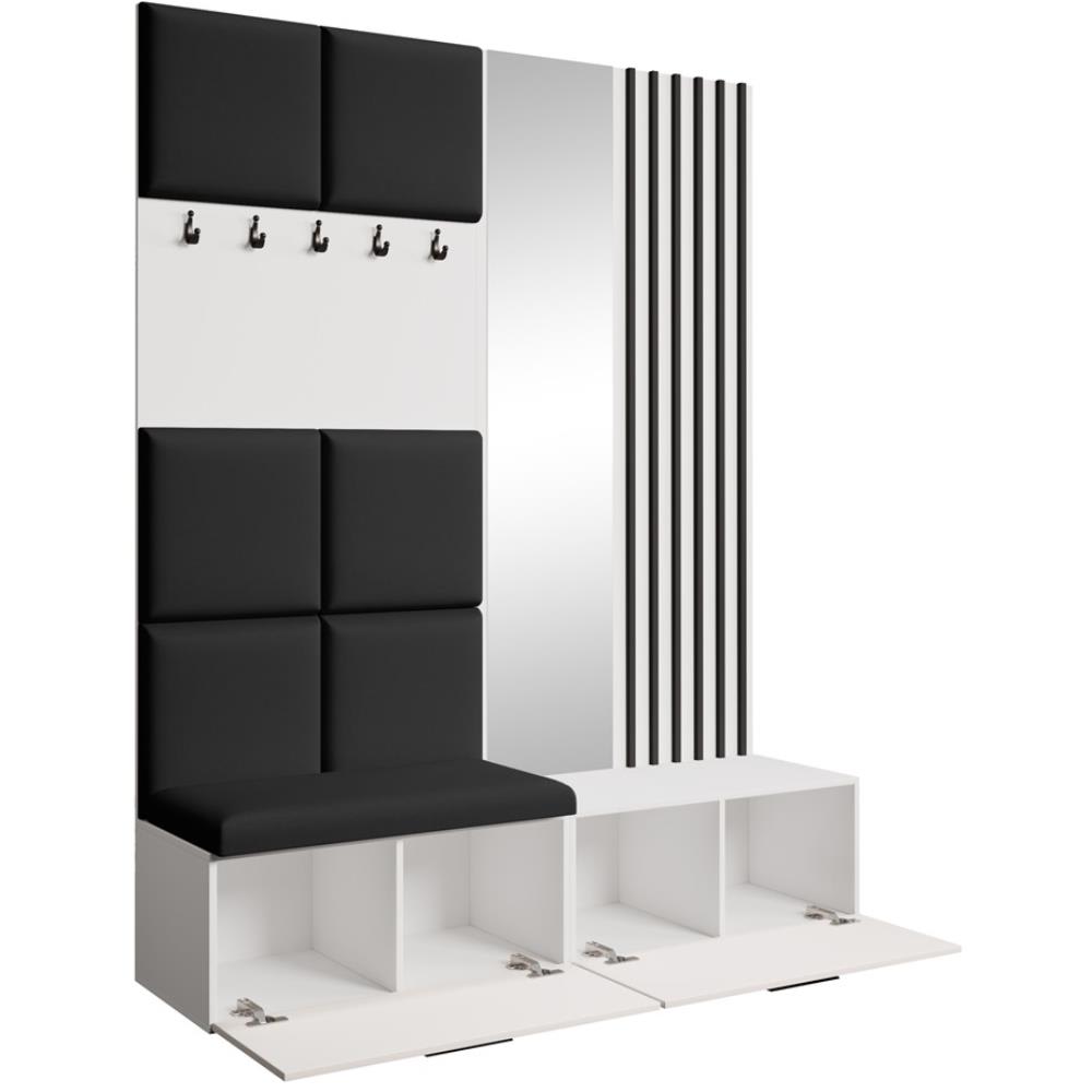 Die moderne Garderobe mit Schuhschrank, gepolsterten Paneelen, Spiegel und Lamellen ist eine stilvolle und funktionale Lösung für deinen Flur. Mit einer Breite von 162 cm bietet sie viel Platz für Schuhe, Oberbekleidung und Accessoires.