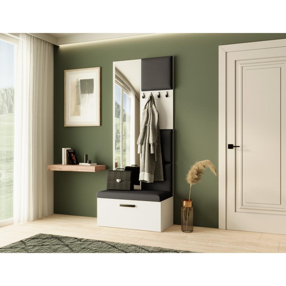 Die gepolsterten Paneele bieten nicht nur ein elegantes Design, sondern auch einen bequemen Sitzplatz, ideal zum Schuhe anziehen. Der große Spiegel ermöglicht es dir, dein Outfit schnell zu überprüfen, während die praktischen Kleiderhaken zwischen den Paneelen für eine optimale Organisation von Jacken und Mänteln sorgen.