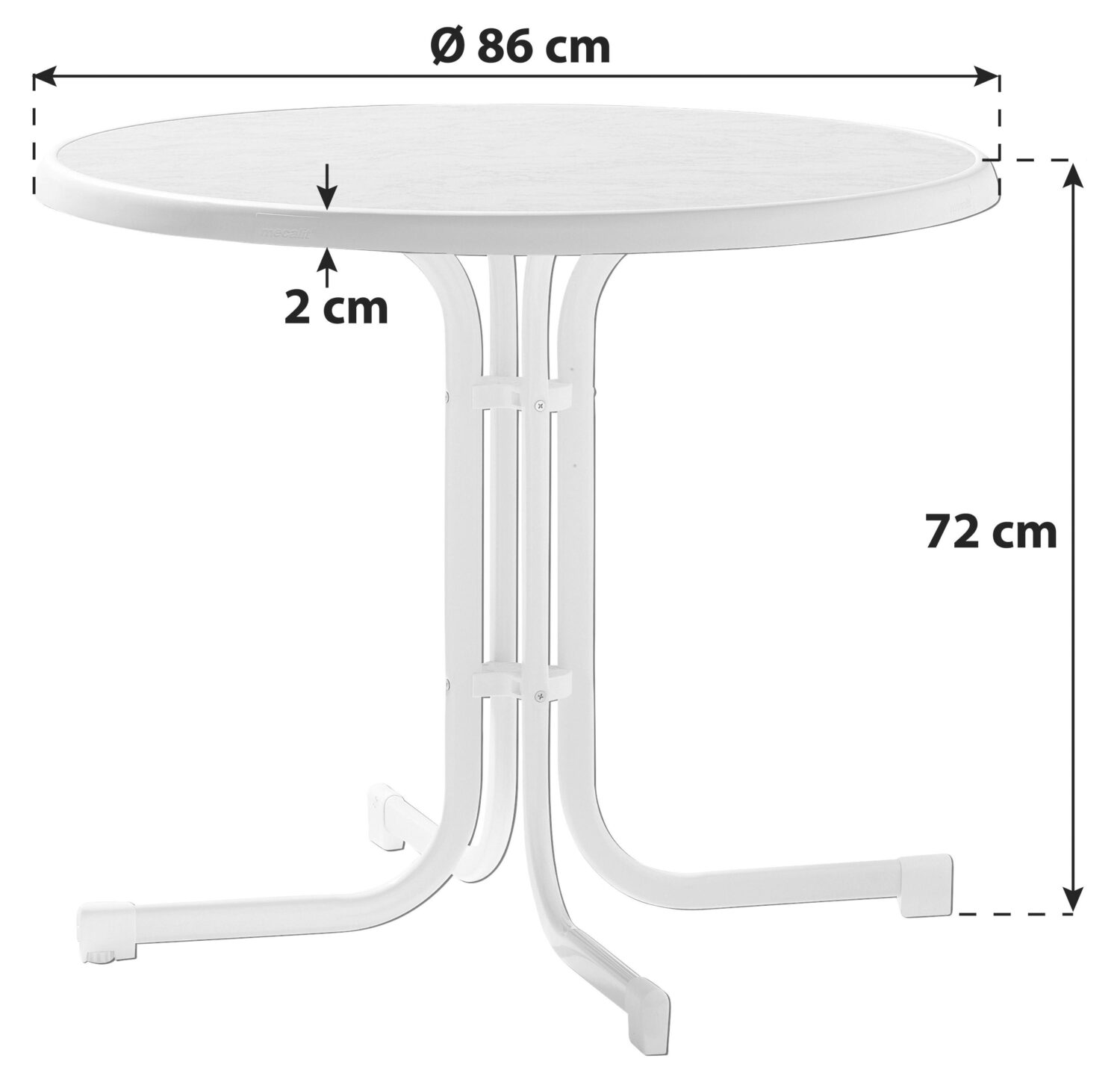 Unser kleiner runder Gartentisch in strahlendem Weiss ist die perfekte Lösung für kleine Außenbereiche. Mit Abmessungen von ca. 86 x 86 x 72 cm (L x B x H) passt er selbst auf den kleinsten Balkon oder in die engsten Nischen im Garten.