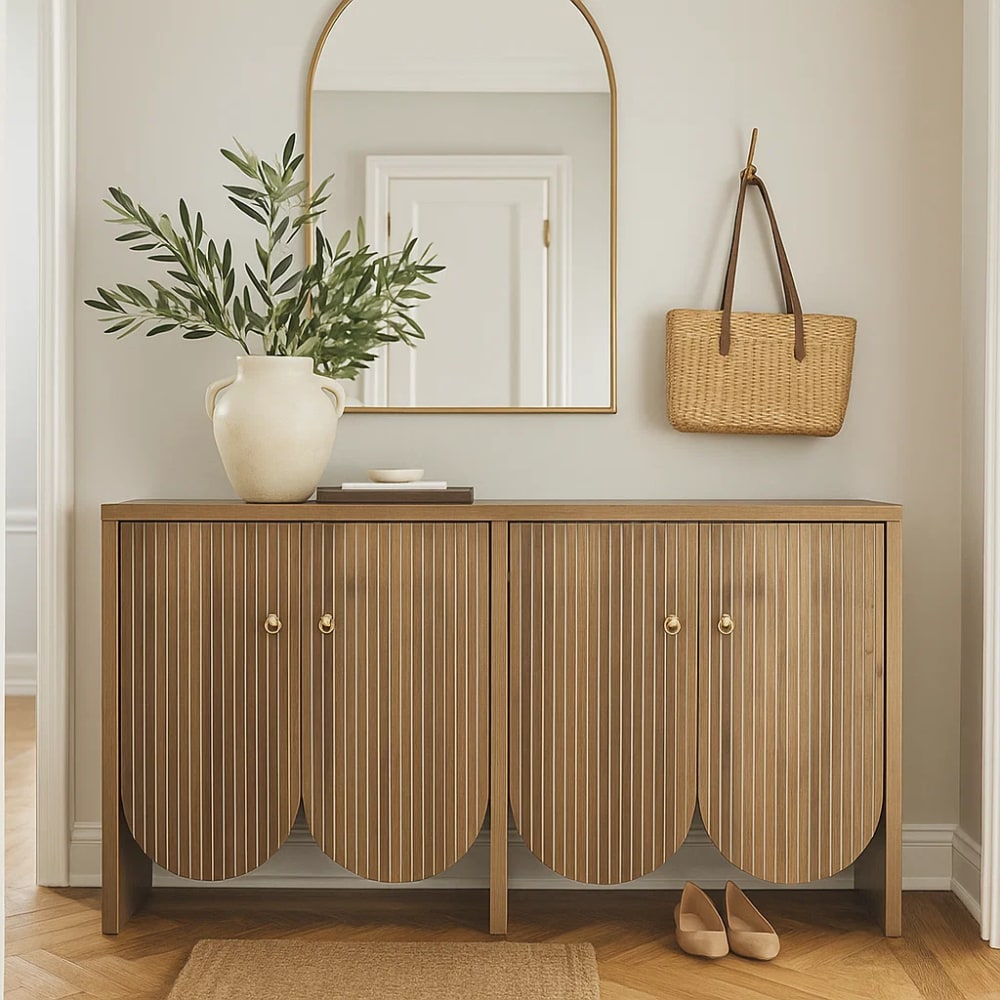 Dieser gerippte Schuhschrank aus Holz mit abgerundeten, gemusterten Türen vereint Stil, Funktionalität und Langlebigkeit und bietet Ihnen eine elegante Aufbewahrungslösung, die sich perfekt für anspruchsvolle Innenräume eignet.