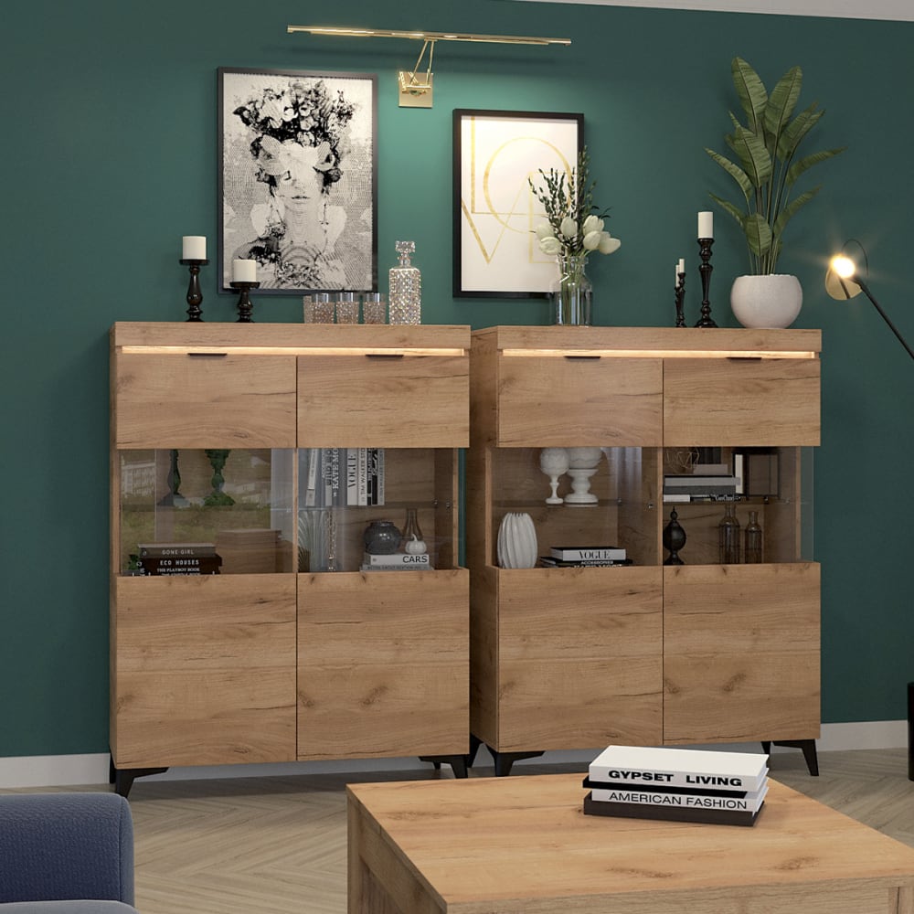 2-türiges LED-Schrankregal inkl. Ruben HolzKollektion :: Ruben Materialien : Vorderseite aus MDF-PlattenKorpus aus LaminatplattenGriffe aus MetallFüße aus ABS Farben: Holz in EichenoptikBeine und Griffe mattschwarz Eigenschaften: 2 Glastüren7 Regale, davon 2 aus Glas Türen mit geräuschlosem SchließsystemSchubladenschienen mit VollauszugKaltweißer LED-Lichtstreifen InklusiveLED zum Einstecken in die Steckdose mit einem Ein-/Ausschaltknopf Gewicht und Abmessungen des Produkts: 65 kg105 x 40 x 140 cm Verpackung : Produkt wird zur Montage geliefert, inkl. Anleitung Garantie: 24 Monate Gesamtanzahl der Kartons : 4