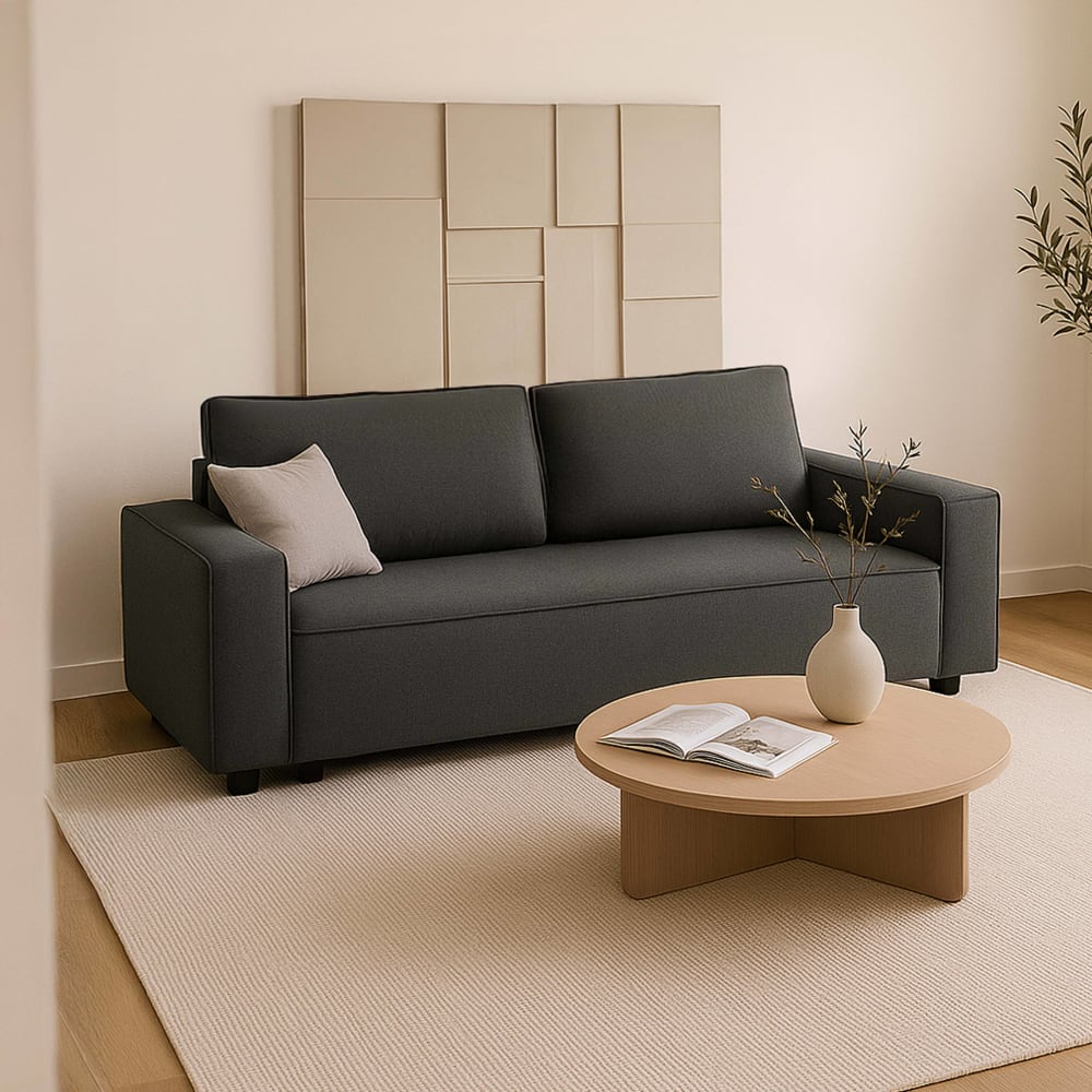 Verwandeln Sie Ihren Wohnraum mit unserem 3-Sitzer-Umbausofa mit modernem Design, das Raffinesse und Zweckmäßigkeit vereint. Dieses Sofa bietet gleichzeitig Komfort und Ästhetik und zeichnet sich durch seine solide Struktur aus Eukalyptusholz aus, die eine außergewöhnliche Langlebigkeit garantiert und Ihrer Inneneinrichtung eine warme Note verleiht. Der Sitz besteht aus hochwertigem Polyurethanschaum und bietet einen harmonischen Sitzkomfort, der zum Entspannen einlädt. Auch die Rückenlehne aus Polyesterschaum bietet optimalen Halt, sodass Sie kompromisslos entspannen können. Die Polyethylenfüße sorgen für eine moderne Dimension und sorgen gleichzeitig für die Stabilität des Ganzen. Stilistisch ist dieses umwandelbare Sofa in verschiedenen trendigen Farben erhältlich, sodass Sie es an Ihre Inneneinrichtung anpassen können. Ganz gleich, ob Sie neutrale Töne oder gewagtere Farbtöne bevorzugen, Sie werden die perfekte Farbe entdecken, um Ihr Wohnzimmer aufzuhellen.Abmessungen: Höhe 82 cm, Tiefe 93 cm, Länge 220 cm, Sitzhöhe 41 cm