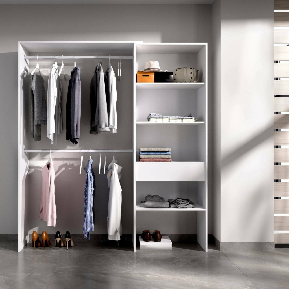 GROßER KLEIDERSCHRANK – Struktur für begehbaren Kleiderschrank, offener Kleiderbügel, 160 x 40 x 187 cm, Weiß. AUFBAU UND NUTZUNG – Multifunktionaler Kleiderschrank komplett mit vier Regalen, zwei Kleiderbügelstangen und einer Schublade – Dank der Raumaufteilung bietet er reichlich Stauraum – Die gesamte Struktur der Möbel eignet sich perfekt für die platzsparende Einrichtung eines Doppelzimmers Egal ob Kinder- oder Gästezimmer – Die Regale in Kombination mit den Kleiderstangen ermöglichen Ihnen eine ordentliche Aufbewahrung von Kleidung und Kleidungsstücken. QUALITÄT UND DESIGN – Modernes und elegantes Design-Möbelstück, perfekt für die Einrichtung einer zeitgemäßen und hellen Umgebung – Ideal für alle, die nach Funktionalität und platzsparenden Lösungen suchen, ist dieses Produkt perfekt für Häuser und Wohnungen aller Größen – Zwei Jahre Garantie ab Kaufdatum. TECHNISCHE EIGENSCHAFTEN – Vollständig aus melaminharzbeschichteten Spanplatten gefertigt, stoß- und kratzfest sowie langlebig – Möglichkeit, die Größe des Kleiderschranks durch Verstellen der Aluminium-Querstangen von 160 cm auf 110 cm zu reduzieren – Einfache und schnelle Reinigung dank des Materials, aus dem es besteht – Geräusch- und kratzfeste ABS-Stollen für den unteren Teil des Möbels – Kanten mit Melaminbeschichtung – Rückseite des Möbels aus Faserplatte mittlerer Dichte – Klassifizierung nach Inhalt oder Freisetzung von Formaldehyd vom Typ E1 – Lieferung zerlegt mit Montagesatz und Anleitungsheft – Besondere Sorgfalt und Aufmerksamkeit auf die Verpackung, die widerstandsfähig und für den Transport geeignet ist – Der Zusammenbau der Möbel ist reversibel. ABMESSUNGEN IN CM – Kleiderschrank: Maximale Länge: 160, Mindestlänge: 110, Breite: 40, Höhe: 187