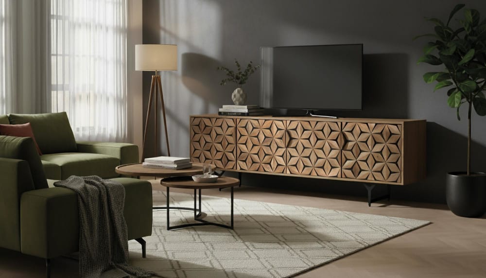Dieser viertürige Fernsehschrank ist aus Mangoholz gefertigt und hat eine natürliche Oberfläche, die die Holzmaserung hervorhebt. Sein Design vereint Funktionalität und modernen Stil und hebt seine Türen durch eine Reliefgravur geometrischer Formen hervor. Hinter zwei Türen verbirgt sich ein praktisches Regal zum Ordnen von Gegenständen, während sich hinter den beiden anderen Türen ein großer offener Raum verbirgt. Die Beine aus Eisen mit Y-förmigem Design sind mattschwarz lackiert, wodurch ein eleganter Kontrast zur Wärme des Holzes entsteht und die Stabilität und Widerstandsfähigkeit des Möbelstücks gewährleistet wird. ● Höhe: 58 cm. ● Länge: 177 cm. ● Breite: 40 cm. ● Material: Mangoholz. ● Farbe: Natur. ● Gewicht: 45 kg. ● Kartongröße: 49 x 183 x 50 cm. ● Montage erforderlich