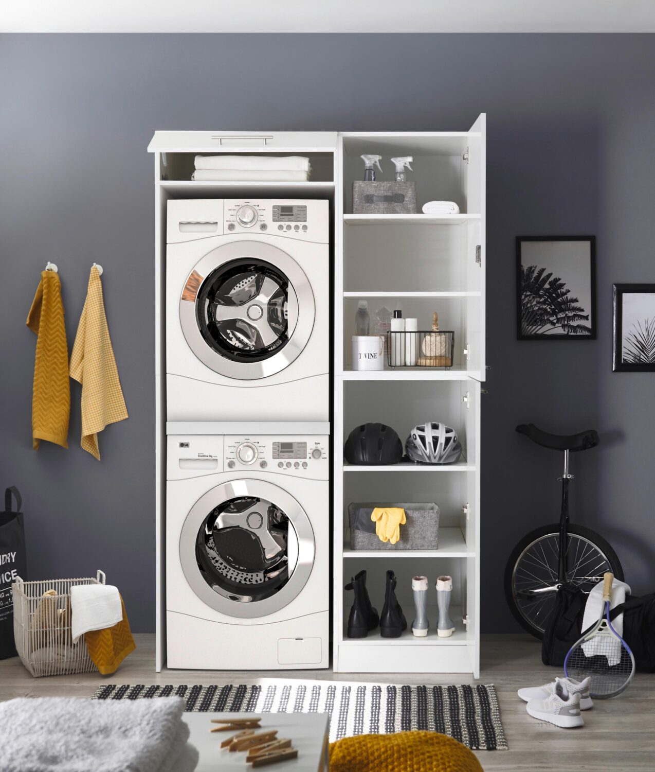Organisieren Sie Ihren Hauswirtschaftsraum neu und lassen Sie sich von den Respekta Möbeln begeistern. Effizienz war noch nie so einfach und stilvoll wie mit dem Respekta Hauswirtschaftsraum Clara in Weiß. Dieses vielseitige Möbelstück vereint Funktionalität und modernes Design und sorgt dafür, dass Ihr Hauswirtschaftsraum perfekt organisiert und ansprechend gestaltet ist. Erleben Sie, wie einfach smarte und effiziente Ordnung sein kann. Das Hauswirtschaftsraumelement Clara bietet auf einer Breite von ca. 117 cm die ideale Lösung, um Waschmaschine, Trockner und Ihre gesamte Wäsche übersichtlich und schnell zugänglich zu verstauen. Ob nach Farben sortiert oder individuell organisiert, dieses Element maximiert den verfügbaren Platz und wird Sie begeistern. Ausgestattet mit 1 Tür mit Soft-Close-System und 4 smarten Klappen wird die Organisation Ihrer Wäsche spielend leicht und sorgt für Ordnung. Die halbhohen Klappen ermöglichen es, Wäsche zu entnehmen oder zu verstauen, ohne die Türen öffnen zu müssen. Bringen Sie Struktur in Ihre tägliche Routine und genießen Sie die Vorteile eines perfekt organisierten Hauswirtschaftsraums. Komplette Maße: ca. 117 x 200 x 67,6 cm (B x H x T). Organisieren Sie Ihren Hauswirtschaftsraum neu und steigern Sie Ihre Effizienz mit dem Respekta Wäscheschrank Clara in Wei&