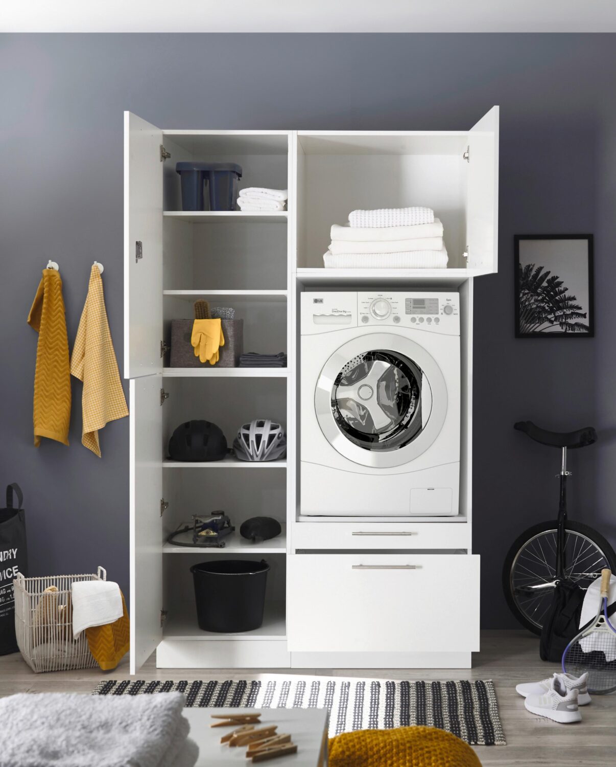 Organisieren Sie Ihren Hauswirtschaftsraum neu und lassen Sie sich von den Respekta Möbeln begeistern. Effizienz war noch nie so einfach und stilvoll wie mit dem Respekta Hauswirtschaftsraum Clara in Weiß. Dieses vielseitige Möbelstück vereint Funktionalität und modernes Design und sorgt dafür, dass Ihr Hauswirtschaftsraum perfekt organisiert und ansprechend gestaltet ist. Erleben Sie, wie einfach smarte und effiziente Ordnung sein kann. Mit dem Hauswirtschaftsraumelement Clara schaffen Sie auf einer Breite von ca. 117,4 cm eine optimale Lösung, um Waschmaschine oder Trockner, Ihre komplette Wäsche sowie Putzutensilien ordentlich und schnell zugänglich zu verstauen. Dieses Element bietet eine enorme Platzersparnis, die Sie begeistern wird. Eine der beiden Schubladen des Schranks ist nicht nur ein angenehmer Ablageplatz für Ihren Wäschekorb, sondern auch ideal zum Zusammenlegen frisch gewaschener Kleidung geeignet. Mit 3 Türen, die mit einem Soft-Close-System ausgestattet sind, wird die Organisation Ihrer Wäsche spielend leicht und schafft Ordnung. Die abschließbare Tür des praktischen Schranks sorgt für zusätzlichen Stauraum, der sicher vor Kindern geschützt ist. Bringen Sie Struktur in Ihre alltägliche Routine und genießen Sie die Vorteile eines perfekt organisierten Hauswirtschaftsraums mit dem Hauswirtschaftsraumelement Clara. Komplette Maße: ca. 117,4 x 200 x 67,6 cm (B x H x T).