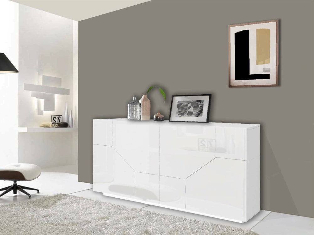 KOMMODE – Küchen-Sideboard mit 4 Türen, Wohnzimmer-Buffet, MADE IN ITALY, 200 x 43 x 86 cm, glänzendes Weiß. AUFBAU UND NUTZUNG – Praktisches und platzsparendes Wohnzimmer-Sideboard mit vier Flügeltüren mit geometrischem Effekt, innen strukturiert mit bequemen Einlegeböden – Die Türen haben keine Griffe und sind mit starken Scharnieren und Metallführungen ausgestattet, die Öffnung erfolgt über einen Druckknopf Zugsystem – Die Struktur ist komplett in glänzendem Weiß gehalten – Die obere Ablage ist perfekt für die Unterbringung Ihres Fernsehers oder Ihrer Lieblingsdekorationen. MADE IN ITALY – Der Artikel wird in Italien hergestellt, unter Verwendung der besten Materialien und höchster Qualität und Liebe zum Detail – Die Sorgfalt der Produktionsprozesse steht für Zuverlässigkeit, Widerstandsfähigkeit und Raffinesse – Die Made in Italy-Zertifizierung ist eine Garantie Vollständige Einhaltung der Vorschriften der Europäischen Union. TECHNISCHE EIGENSCHAFTEN UND MONTAGE – Einrichtungsgegenstand vollständig aus 16 mm starken FSC-zertifizierten Melamin-Laminatholzplatten gefertigt – Es ist stoß- und kratzfest, langlebig und wasserfest – Schnelle und einfache Reinigung dank des Materials, aus dem es hergestellt ist – Das Möbelstück wird zerlegt geliefert Bausatz- und Montageanleitungsheft – Besondere Sorgfalt und Aufmerksamkeit auf eine widerstandsfähige und für den Transport geeignete Verpackung – ISO 9001-Zertifizierung für die Entwicklung und Herstellung von Möbelbausätzen. ABMESSUNGEN IN CM – Sideboard: Länge: 200 Breite: 43 Höhe: 86