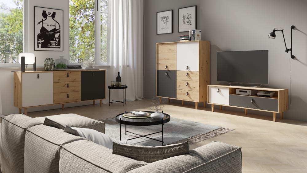 Das Sideboard im skandinavischen Design mit matt weißer und grauer Front, hat einen Korpus in Artisan Eichen-Optik