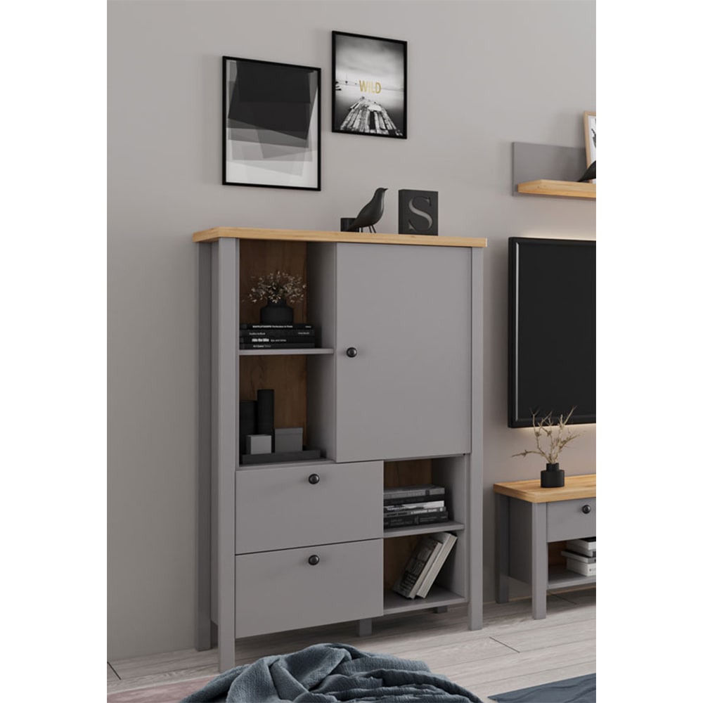 Ein zeitlos schönes und praktisches Highboard im modernen Style aus Eiche Delano hell und schiefergrau.Das Highboard lässt sich hervorragend integrieren und bietet Ihnen viel Stauraum.