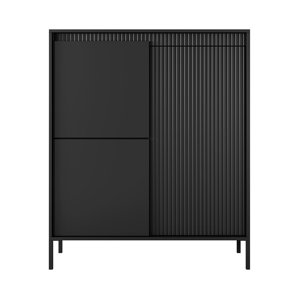 – Grifflos- ABS Kanten- Push-to-open Funktion- Metallfüße- 3 Türen- links: 3 Einlegeböden- rechts: 2 Einlegeböden- B/T/H: 104cm / 40cm / 124cm