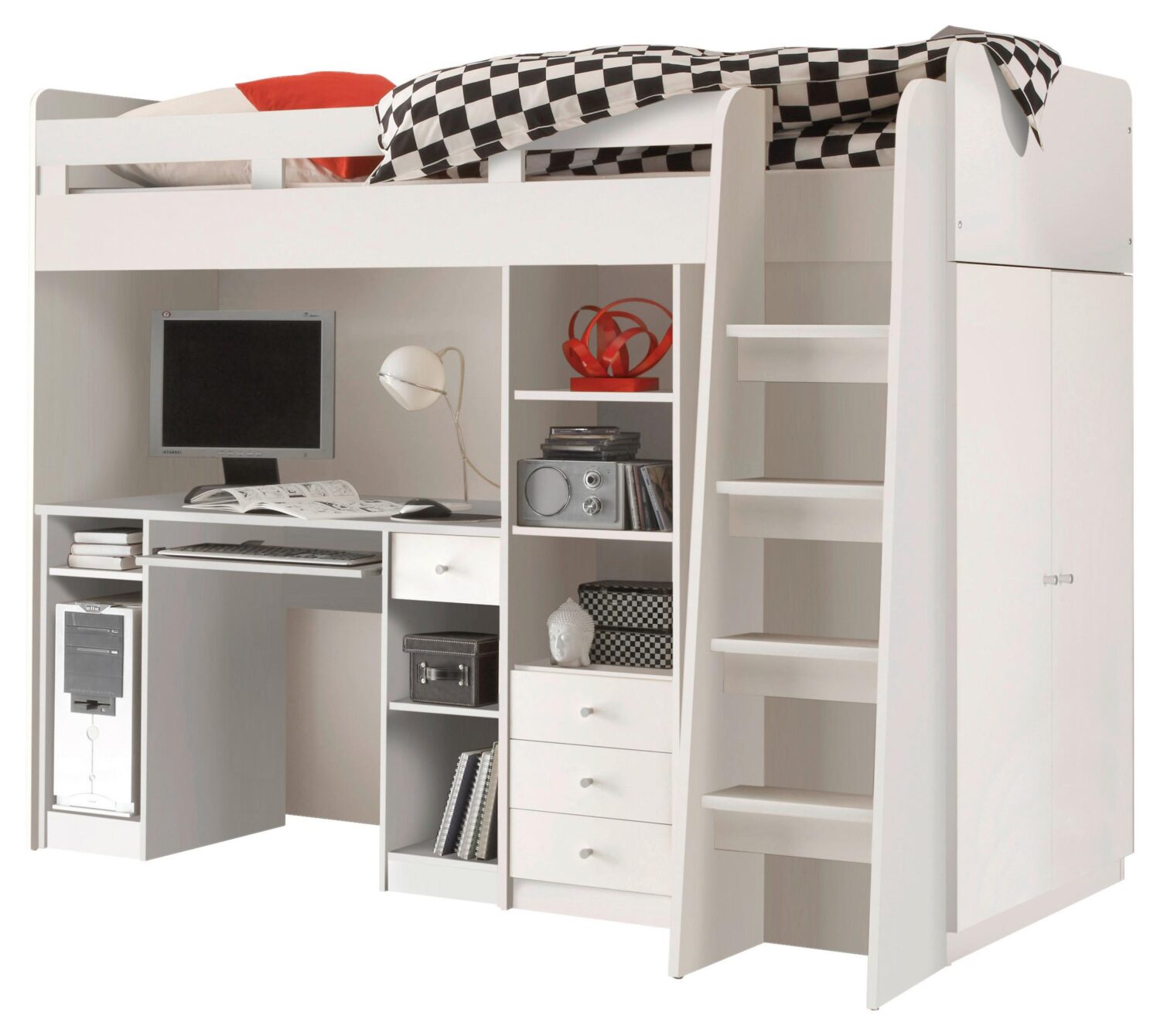 Dieses Stauraumbett in Weiß ist ein wahres Multitalent fürs Kinderzimmer, vereint es doch Schlafplatz, Arbeitsplatz und viel nützlichen Stauraum. Und all das verpackt in eine ansprechende Optik mit frischer Farbgebung für ein Ambiente zum Wohlfühlen. Absturzsicherung und eine kinderfreundliche Leiter sorgen für mehr Sicherheit und einen einfachen Aufstieg in das Bett. Das ca. 204 x 160 x 124 cm (B x H x T) große Hochbett aus MDF verfügt über einen integrierten Kleiderschrank mit 2 Drehtüren, ein Regal mit 3 offenen Fächern und 3 Schubladen sowie einen Schreibtisch mit 4 offenen Fächern und 1 Schublade. Mit diesem gut durchdachten Stauraumbett holen Sie sich ein flexibles Möbelstück für viele Jahre ins Kinderzimmer. Lieferung ohne Lattenrost und Matratze. Das Bett mit einer Liegefläche von ca. 90 x 200 cm (B x L) ist auch seitenverkehrt montierbar.