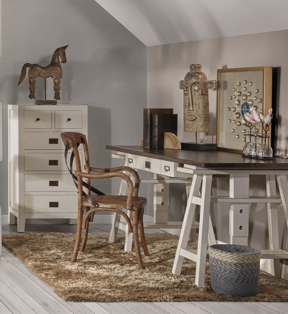 Der EVEREST-Schreibtisch ermöglicht Ihnen die Höhenverstellung der Tischplatte in 3 Positionen. Er ist aus massivem Mindi-Holz gefertigt und verfügt über bronzeGriffe. Darüber hinaus verfügt dieser Schreibtisch über eine geheime Schublade, um Ihre kostbarsten Besitztümer aufzubewahren. Die Oberflächenbehandlung des Möbelstücks ist rustikal, mit abgenutzten braunen Details an den Ecken. Montage erforderlich. Minimale und maximale Höhe 78/98 cm.
