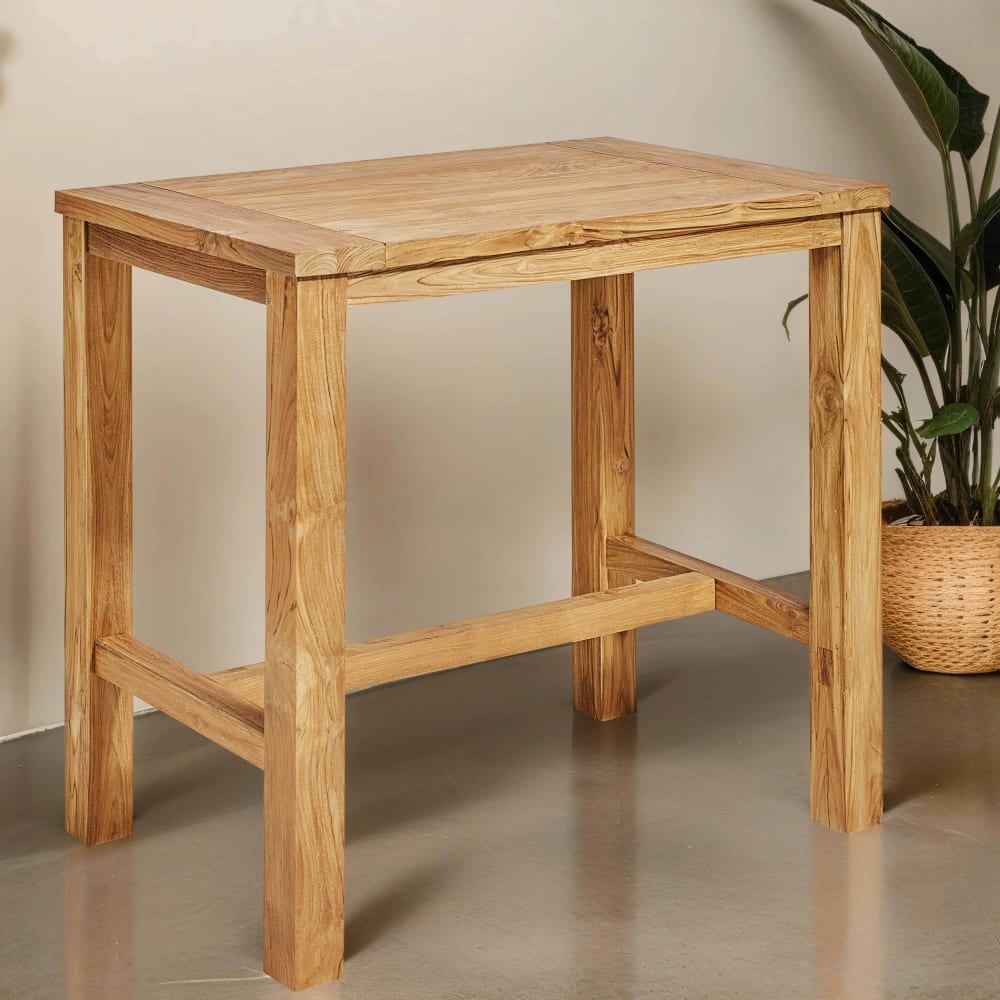 Dieser wunderschöne hohe Tisch verleiht Ihrer Küche, Ihrem Esszimmer oder Ihrer Terrasse Eleganz. Es handelt sich um ein einzigartiges Stück aus 100 % recyceltem massivem Teakholz. Sie werden den unwiderstehlichen Charme lieben, den er mit authentischem Holz ausstrahlt, das bereits eine Geschichte hat. Der Tisch MIRA eignet sich ideal zum Sitzen beim Essen. Kombinieren Sie ihn mit Hockern oder hohen Teakholzstühlen, um ein harmonisches Ensemble zu schaffen. Möchten Sie ihn lieber als Stehtisch verwenden? Er eignet sich perfekt für ein Frühstück oder eine schnell eingenommene Mahlzeit. Stellen Sie ihn in Ihr Wohnzimmer oder auf Ihre Terrasse, um Ihre Gäste zu empfangen. Sie werden köstliche Speisen und gesellige Momente mit Familie oder Freunden teilen. In Bezug auf das Design passt er sowohl zu modernen als auch zu rustikalen Möbeln. Der Tisch MIRA findet auch in einem skandinavischen Interieur seinen Platz, indem er sich mit geraden und klaren Linien verbindet. Überprüfen Sie seine Maße, um sicherzustellen, dass er gut in Ihren Raum passt. Er misst 110 cm in der Höhe, 120 cm in der Länge und 80 cm in der Breite. Worauf warten Sie, um Ihre Möbel zu erneuern?