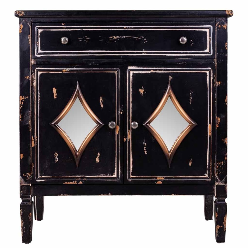Dieser schwarze Konsolentisch kann zum Protagonisten Ihres Flurs, Wohnzimmers oder Schlafzimmers werden und Ihrer Einrichtung einen neuen Look verleihen. Die Konsole besteht aus einer Tannenholzstruktur in schwarzer Farbe mit abgenutztem Effekt und 2 Türen, die mit rautenförmigem Glas verziert sind und dem Möbelstück Charakter und Persönlichkeit verleihen. Eine Konsole, die Sie mit anderen Möbeln aus der gleichen Kollektion kombinieren können, um Ihrer Wohnung ein traumhaftes Aussehen zu verleihen.