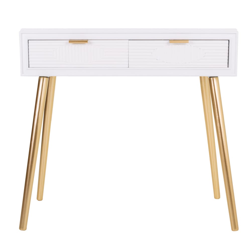 Diese originelle und praktische Konsole besteht aus weißem MDF-Holz mit goldenen Details. Ihre konischen Beine aus MDF-Holz, in Gold lackiert, passen perfekt zu den Knöpfen auf der Vorderseite der Konsole, die mit vertikalen und horizontalen Linien verziert sind und den Möbeln einen eleganten Touch verleihen. Empfohlen als Konsolenmöbel für Wohnzimmer oder andere Räume.