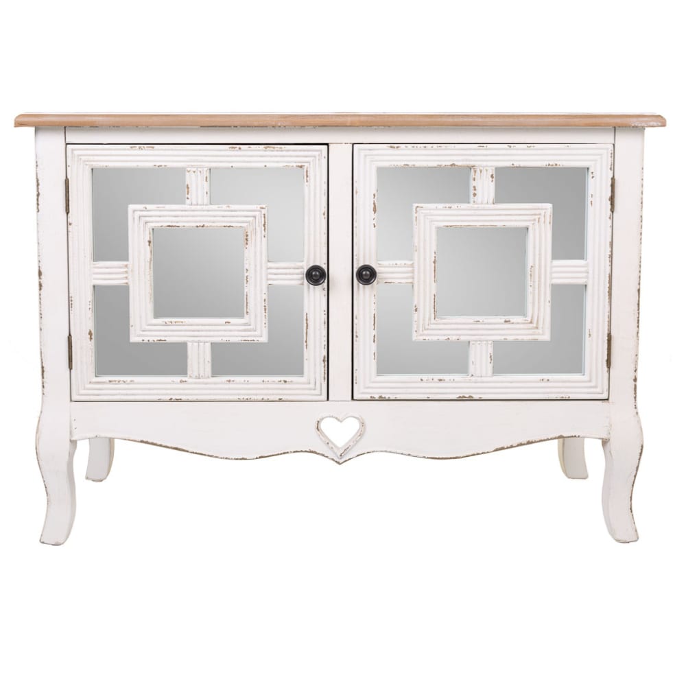 Exotische Holz-Konsole in Weiß mit 2 Türen 83x36x56,5 cm Wir empfehlen Ihnen diese elegante Konsole mit 2 Türen im exotischen Stil aus Tannenholz und MDF, mit dekorativer grauer Lackierung. Die Oberseite des Möbels ist in Naturfarbe und harmoniert perfekt mit dem gealterten Grau der Türen und der Struktur. Das Glas der Türen ist undurchsichtig und verleiht dem Möbelstück einen eleganten Touch. Wir schlagen vor, sie als Konsole oder Aufbewahrungsmöbel im Wohnzimmer oder sogar im Schlafzimmer zu verwenden. Ihre Maße sind: Breite: 83 cm, Höhe: 56,5 cm, Tiefe: 36 cm. Gewicht: 13,60 kg.