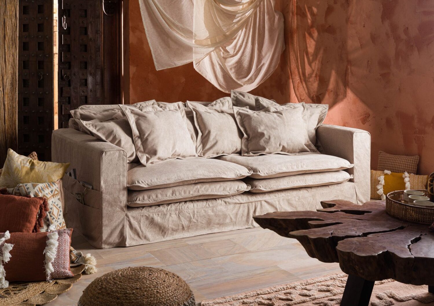edles 3-Sitzer Hussensofa in Beige mit den Maßen 236x138x76 cm weiche Kissen und Polster sorgen für herausragenden Komfort Stauraum inklusive: das Sofa verfügt über praktische Seitentaschen besonders pflegeleicht durch abnehmbare und waschbare Bezüge weitere Sofas entdecken!