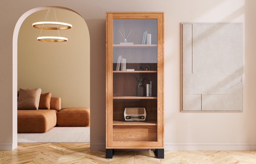 Die Axel-Vitrine wird sich sowohl im Wohnzimmer als auch im klassischen, modernen oder loftartigen Aufenthaltsraum hervorragend bewähren. Vier Fächer geben Ihnen die Möglichkeit, Bücher, Andenken oder Ihr Lieblingsgeschirr auf eine originelle Art und Weise zu präsentieren. Dank solchen Elementen gewinnt der Innenraum an Charakter und der tägliche Blick durch die Glasvitrine ruft angenehme Erinnerungen hervor.