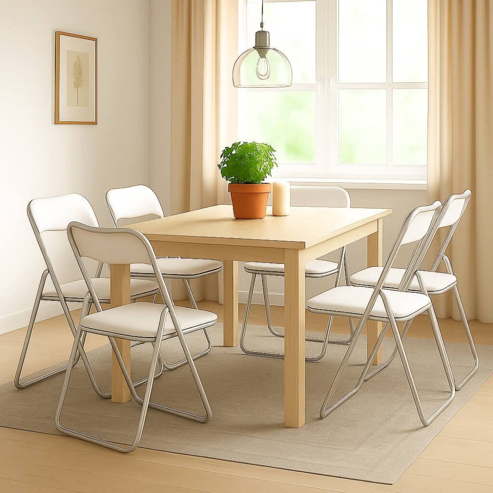 KLAPPSTUHL – platzsparender Sessel, Gästestuhl, Besprechungssitz aus Öko-Leder, 43 x 47 x 80 cm, Weiß. STRUKTUR UND VERWENDUNG – Set aus sechs Stühlen mit widerstandsfähiger Metallstruktur, Sitz und Rückenlehne mit PVC-beschichtetem Polyurethanschaum gepolstert – Ideales Produkt für den Einsatz im Büro bei Besprechungen, Konferenzen oder Geschäftstreffen oder zu Hause für Gäste, Freunde oder Verwandte Ihre Sitzgelegenheit im Esszimmer oder in der Küche – Leicht zusammenklappbar, ideal für die Aufbewahrung in kleinen Räumen, z B hinter einer Tür oder einem Schrank – Die schlichten und modernen Linien dieser Stühle ermöglichen die Platzierung in jeder Art von Umgebung. PRAKTISCH UND INNOVATIV – Praktisches und modernes Möbelstück, perfekt für die Platzierung in einer Umgebung oder Wohnung mit Platzbedarf – Vielseitiges Produkt, ideal für jede Art von Büro oder Wartezimmer. TECHNISCHE EIGENSCHAFTEN – Vollständig aus expandiertem Polyurethan auf einer Metallstruktur gefertigt, ermöglicht es ein völlig sicheres Sitzen – Das Produkt ist dank des Materials, aus dem es hergestellt ist, leicht zu reinigen – Wird bereits montiert geliefert. ABMESSUNGEN IN CM – Klappstuhl: Länge: 43 Breite: 47 Höhe: 79,5 – Sitzhöhe: 43