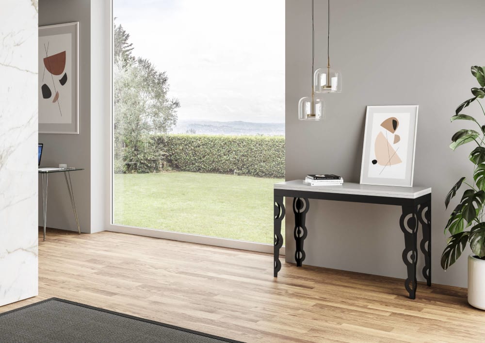 Klappbarer Tisch Karamay Double 120, aus modernem Design und extravagantem Stil, fügt sich perfekt in jeden Einrichtungskontext einund passt sich jeder Situation und jedem Platzbedarf an: Er eignet sich sowohl für den täglichen Gebrauch als auch für gesellige Anlässe, wenn mehrere Gäste zum Essen erwartet werden.