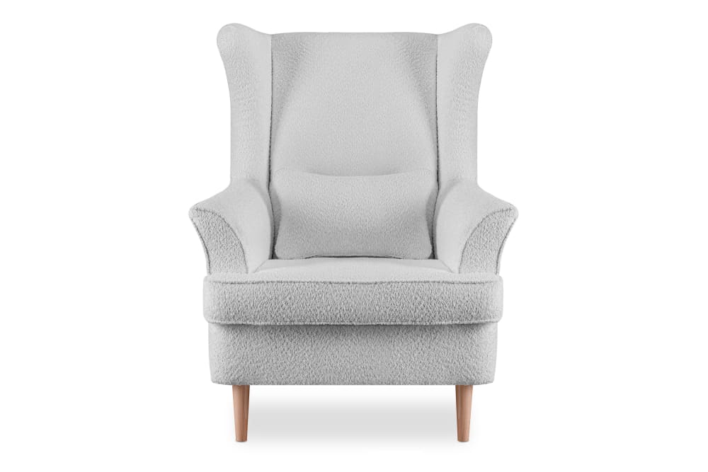 Der skandinavische Sessel auf Beinen ist ein einzigartiges Möbelstück, das durch seine Farbe, die weichen Linien und die Massivholzelemente besticht. Dieser Sessel sieht mit seinen unterschiedlich hohen Holzbeinen – 14 cm vorne und 16 cm hinten – toll aus, die seinen Charakter und Stil unterstreichen.