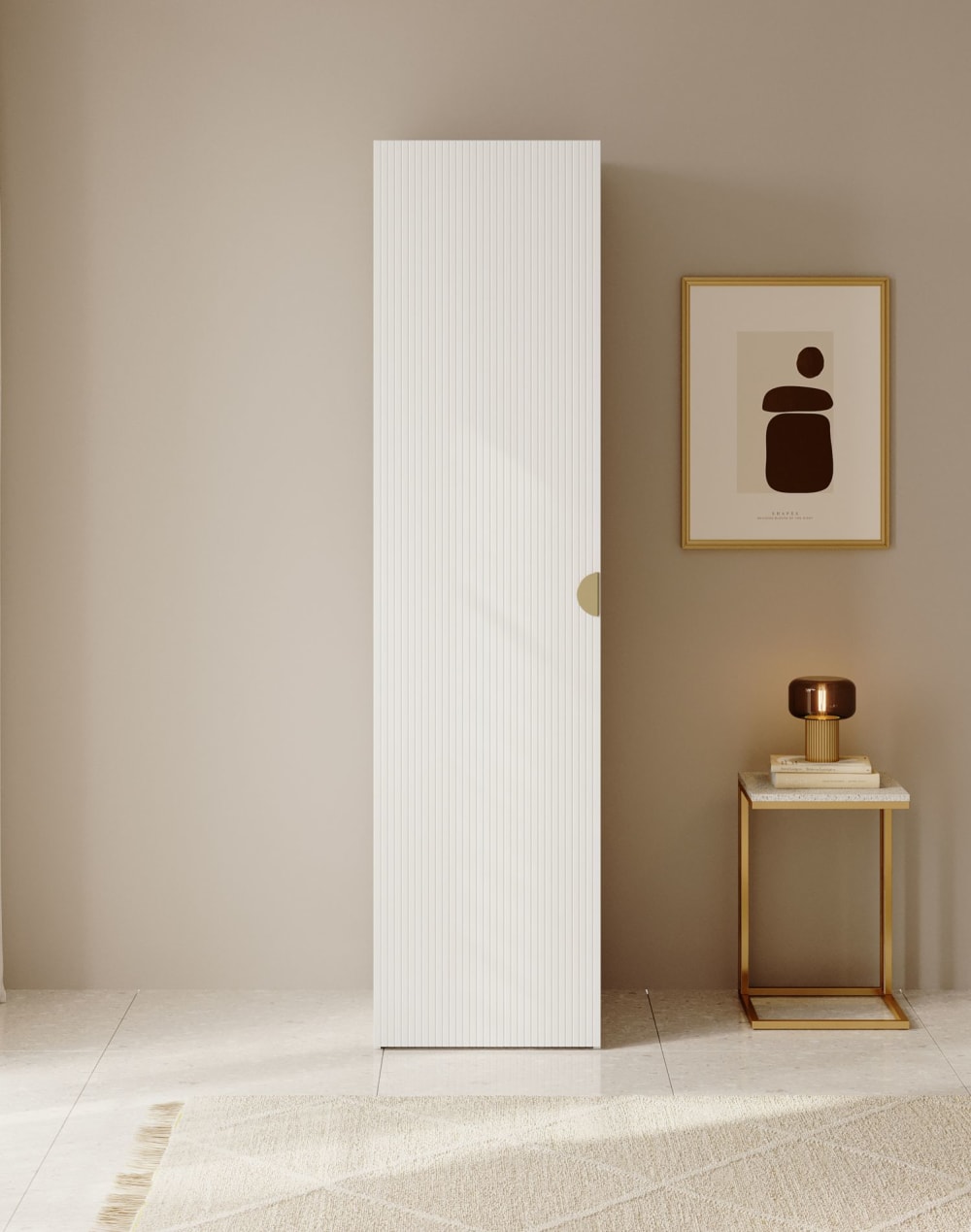 Der Korpus besteht aus hochwertiger laminierter Spanplatte, die nicht nur langlebig, sondern auch besonders pflegeleicht ist. Die Fronten sind mit dezenten Lamellen versehen, die für eine interessante Struktur und einen eleganten Look sorgen. Ein goldener Halbrundgriff aus gebürstetem Stahl setzt einen stilvollen Akzent und bildet einen ansprechenden Kontrast zur matten Oberfläche des Korpus.