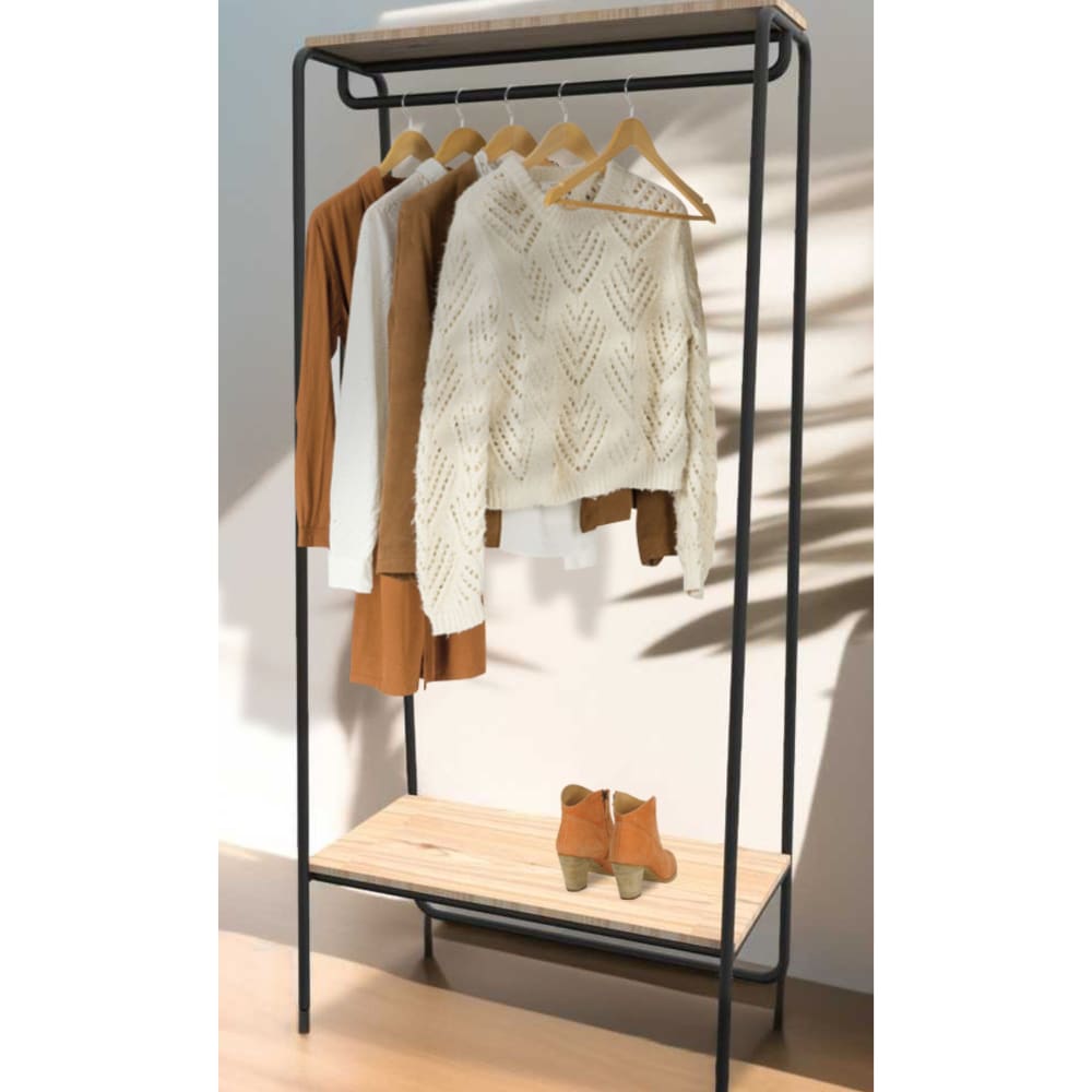 Perfekte Kombination: Harmonische Verbindung von schwarzem Metall und Holz für einen eleganten und funktionalen Kleiderschrank.