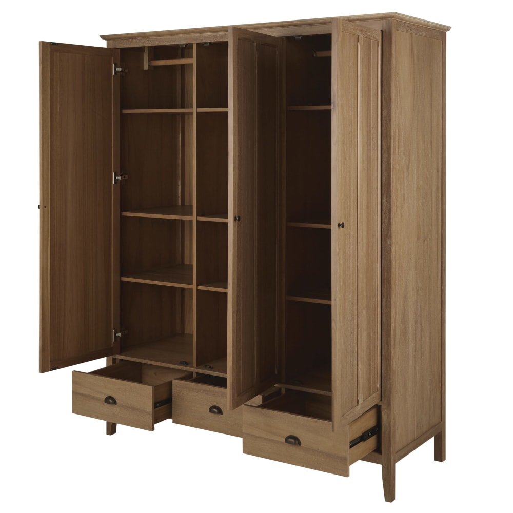 Der Kleiderschrank mit 3 Türen und 3 Schubladen BEAUMONT ist ein elegantes und praktisches Möbelstück, das Ihnen hilft, Ihre Kleidung und Accessoires auf elegante Weise zu ordnen.Dieser Kleiderschrank besticht durch sein elegantes Design, das sich durch seine schlichten Linien und die natürliche Farbe der Akazienholzoptik auszeichnet.Mit seinen 3 Türen, 9 verstellbaren Einlegeböden und 3 Schubladen bietet dieser Kleiderschrank viel Stauraum, um Ihre Kleidung und Accessoires ordentlich und griffbereit aufzubewahren.Dieses Möbelstück von Maisons du Monde wird Ihre Einrichtung perfekt ergänzen!