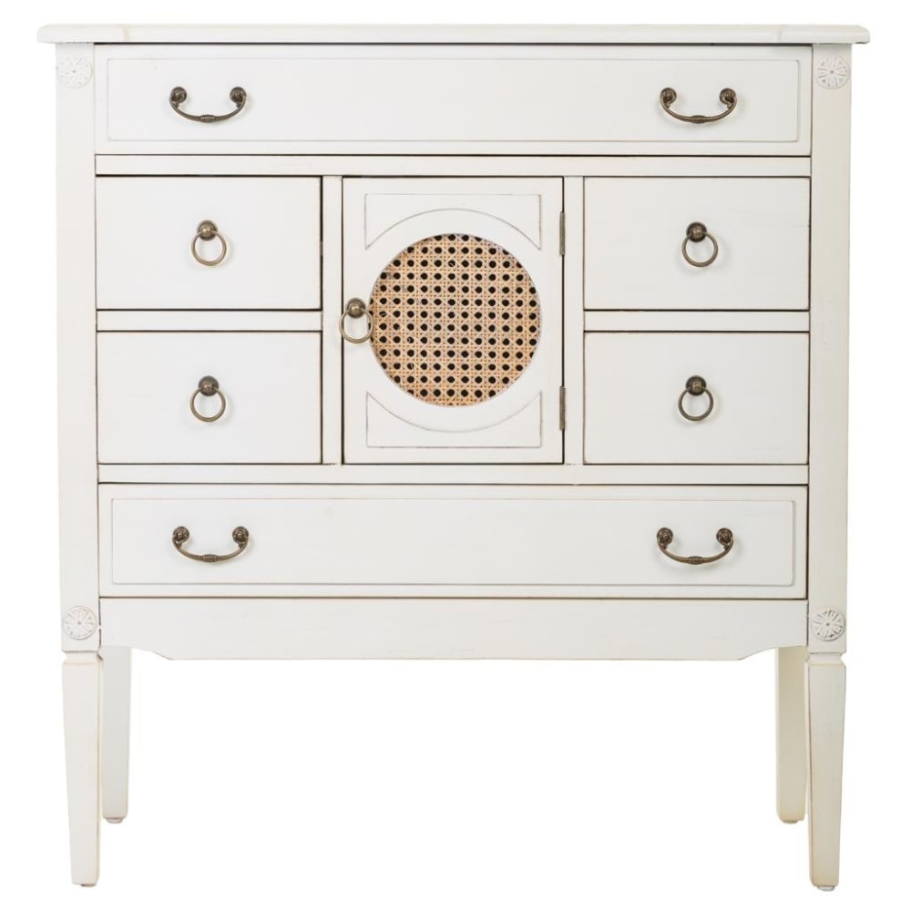 Holz Kommode mit 6 Schubladen und 1 weißen Gittertür 85x38x90h cm- Diese weiße Holz Kommode hat sechs Schubladen und eine Gittertür. Sie hat die Maße 85x38x90 cm und bietet vielseitigen Stauraum für Ihre Bedürfnisse.