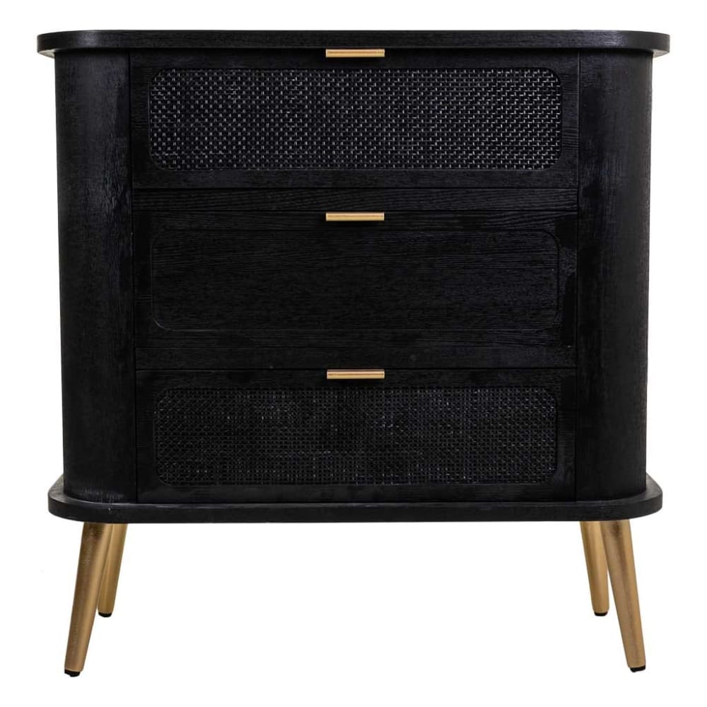 80x35x81 cm Kommode aus schwarzem MDF-Holz mit Gitter Ein warmer, komfortabler und funktionaler Stil, der den Unterschied ausmacht, ist der rustikale Stil mit modernem Design und Ästhetik, kombiniert mit Details, die an die Vergangenheit erinnern, wie diese köstliche Kommode mit Gitterfronten. Die Kommode besteht aus einer MDF-Holzstruktur und die Schubladenfronten sind aus Naturfasergewebe gefertigt. Ein elegantes Stück, das Sie zum Protagonisten Ihrer Schlafzimmerdekoration machen können. Sie verfügt über 3 Schubladen mit goldfarbenen Griffen. Seine Abmessungen: Länge: 80 cm. Höhe: 81 cm. Tiefe: 35 cm.