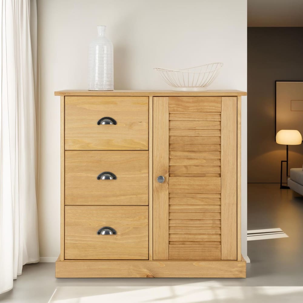 Die Massivholz Kommode Veneta ist eine praktische und stilvolle Ergänzung für dein Zuhause. Gefertigt aus Kiefernholz, überzeugt sie mit ihrer natürlichen Optik und robusten Verarbeitung. Drei geräumige Schubladen und ein Fach mit Einlegeboden bieten jede Menge Stauraum für Kleidung, Dokumente oder Alltagsgegenstände. Die Oberfläche ist gebeizt und gewachst, sodass die Holzmaserung schön zur Geltung kommt. Abgerundet wird das Design durch Metall-Muschelgriffe, die für einen hochwertigen Look sorgen. Dank ihres schlichten, zeitlosen Designs passt die Kommode in viele Wohnbereiche und lässt sich vielseitig kombinieren.