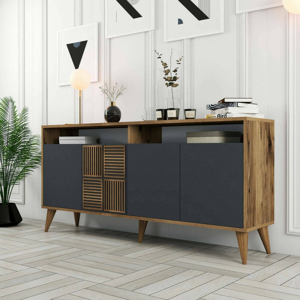 KOMMODE – Wohnzimmerbuffet, Wohnzimmer-Sideboard, Moderne Küchen-Speisekammer, 160x35h79 cm, Walnuss und Anthrazit. AUFBAU UND VERWENDUNG Mehrzweck-, praktische und platzsparende Wohnzimmermöbel mit elegantem und funktionalem Design Kann auch als TV-Schrank verwendet werden, in dem Sie Ihre Lieblingsornamente aufbewahren können Dieses multifunktionale Einrichtungselement eignet sich perfekt für die Dekoration des Esszimmers Ob im Wohnzimmer, im Flur, im Eingangsbereich oder im Büro, in dem sich ordentlich Geschirr, Gläser, Tischdecken, Besteck, Bücher, Dokumente oder Dekorationsgegenstände befinden. QUALITÄT UND DESIGN – Modernes und elegantes Design-Möbelstück, perfekt für die Einrichtung einer zeitgemäßen und hellen Umgebung – Ideal für alle, die nach Funktionalität und platzsparenden Lösungen suchen, ist dieses Produkt perfekt für Häuser und Wohnungen aller Größen – Zwei Jahre Garantie ab Kaufdatum – Montiert. TECHNISCHE EIGENSCHAFTEN Vielseitiges Einrichtungszubehör, konzipiert für die einfache Integration mit anderen Möbeln Widerstandsfähige Verpackung, konzipiert für den E-Commerce – Material: Melaminbeschichtete Platte 18mm, Polypropylen – Zusätzliche Infos: Zusätzlicher Platz zahlreiche Einlegeböden mit Reißverschluss Standardverschluss. ABMESSUNGEN IN CM – Kommode : Länge: 160 Breite: 35 Höhe: 78,6