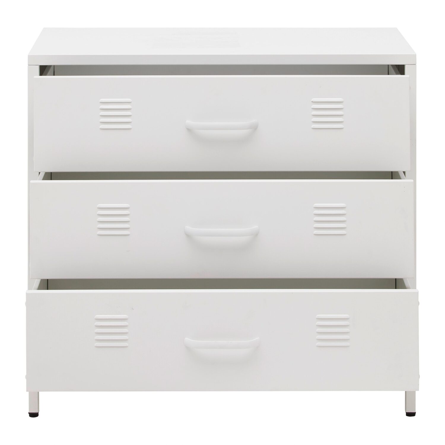Mit der Kommode Metallica in Weiß verbinden Sie den robusten Industrie-Look mit einer zarten, modernen Farbgebung, die Ihrem Zuhause eine besondere Eleganz verleiht. Die Kommode misst ca. 78 x 73 x 40 cm (B x H x T) und bietet dank ihrer drei Schubladen mit Inneneinteilung viel Stauraum für Ihre persönlichen Gegenstände. Die Kombination aus 100 % Metall – speziell Gusseisen – sorgt für eine einzigartige Optik, die das Möbelstück zu einem wahren Highlight in Ihrem Wohnraum macht. Mit einer maximalen Belastbarkeit von ca. 30 kg ist die Kommode Metallica nicht nur optisch ein Genuss, sondern auch äußerst funktional. Die weißen Henkel aus Stahl und die eckigen Füße, ebenfalls in Weiß, runden das moderne Design perfekt ab und verleihen der Kommode eine harmonische, zurückhaltende Ausstrahlung. Die Fußhöhe von ca. 10 cm sorgt für eine schwebende Optik und trägt zur Leichtigkeit des Möbelstücks bei. Setzen Sie auf die Kommode Metallica, um Ihre Wohnung im angesagten Industrie-Stil mit einer zarten weißen Note zu bereichern. Ein echtes Highlight, das sowohl funktional als auch stilvoll ist.