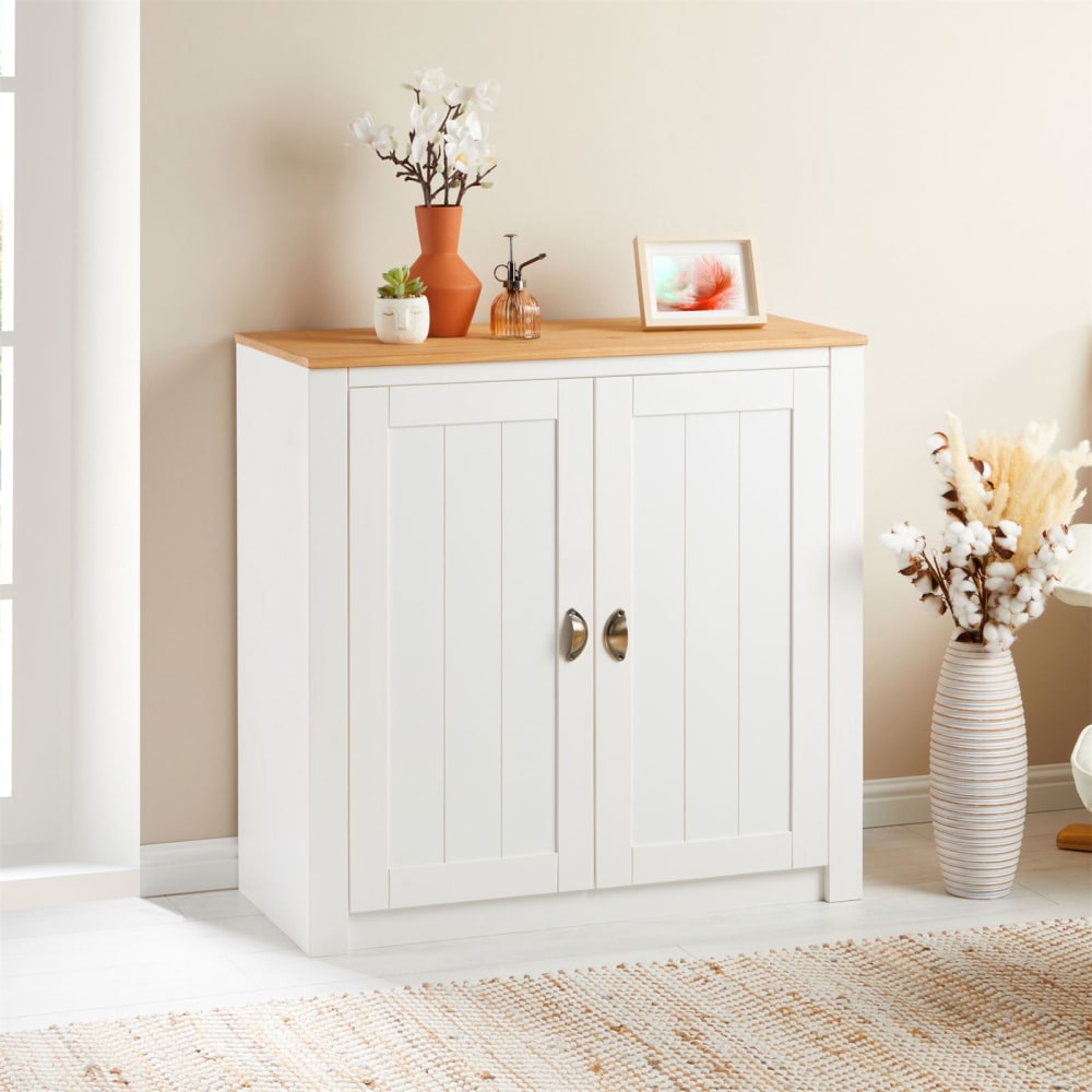macht Ihr Leben einfacher und setzt Akzente in Ihre Einrichtung. Die Kommode aus Kiefer bietet Ihnen hinter den 2 Türen viel Platz für Geschirr, Tischtextilien, Vasen und Dekomaterial. Die Fronten sind in der akzentsetzenden und modernen Farbe Weiß lackiert. Die Deckplatte aus Holz ist in Natur gehalten und verleiht der Kommode einen modernen und natürlichen Ausdruck. So wird die Kommode im Landhausstil, kombiniert mit Muschelgriffen aus Metall zu einem praktischen Alltagshelfer und echtem Hingucker in Ihrem Zuhause. Hängen Sie über die Kommode Ihr Lieblingsbild oder Fotos von Ihren Liebsten auf und Sie haben eine stilvolle Ecke, die zudem Ordnung schafft.