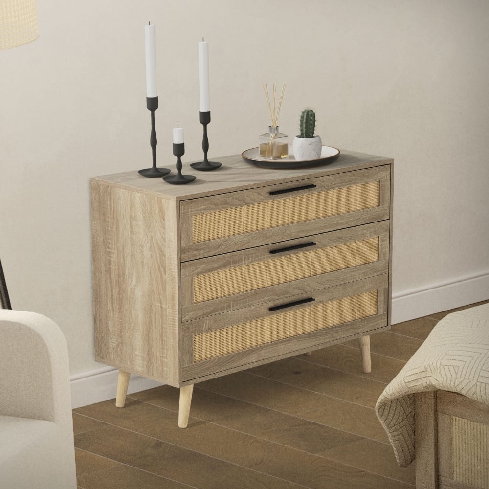 Verleihe deinem Zuhause mit dieser stilvollen Kommode mit Rattan-Front einen natürlichen und modernen Look! Die Kombination aus warmem Holzdekor, geflochtenem Rattan und eleganten Aluminiumgriffen macht dieses Möbelstück zu einem echten Hingucker. Mit drei geräumigen Schubladen bietet sie dir viel Platz zur Aufbewahrung ob im Schlafzimmer, Flur oder Wohnzimmer. Die stabilen Massivholzfüße sorgen für einen sicheren Stand und verleihen der Kommode eine leichte, luftige Optik.