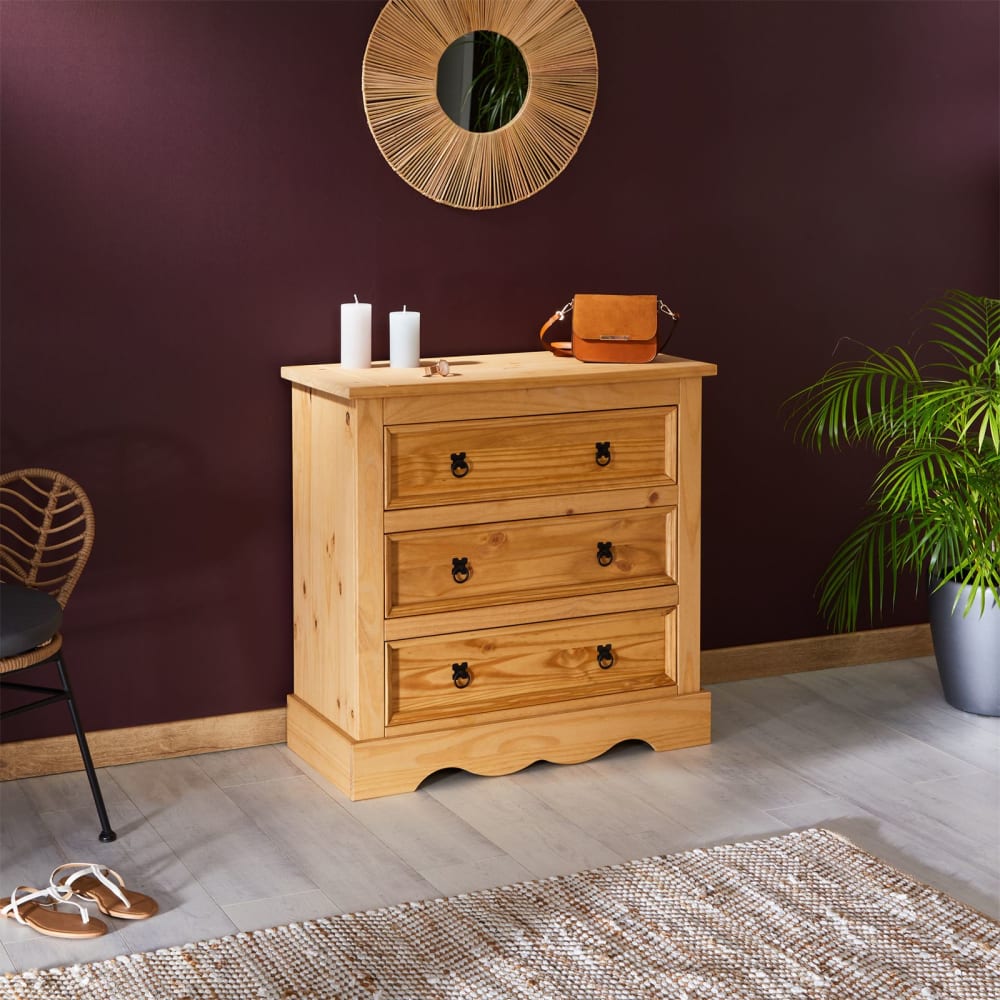 ist aus massivem Kiefernholz gefertigt. Die aufwendig gearbeiteten Schubladen, die Frontblende und die passenden Metallgriffe geben der Kommode den typischen rustikalen Charme. In den 3 großen Schubladen ist genügen Stauraum für Kleidung, Tischwäsche oder auch Spielsachen. Holen Sie sich ein Stück Natur in Ihr Heim und kombinieren Sie weitere Artikel aus der Mexico Möbel Serie miteinander.